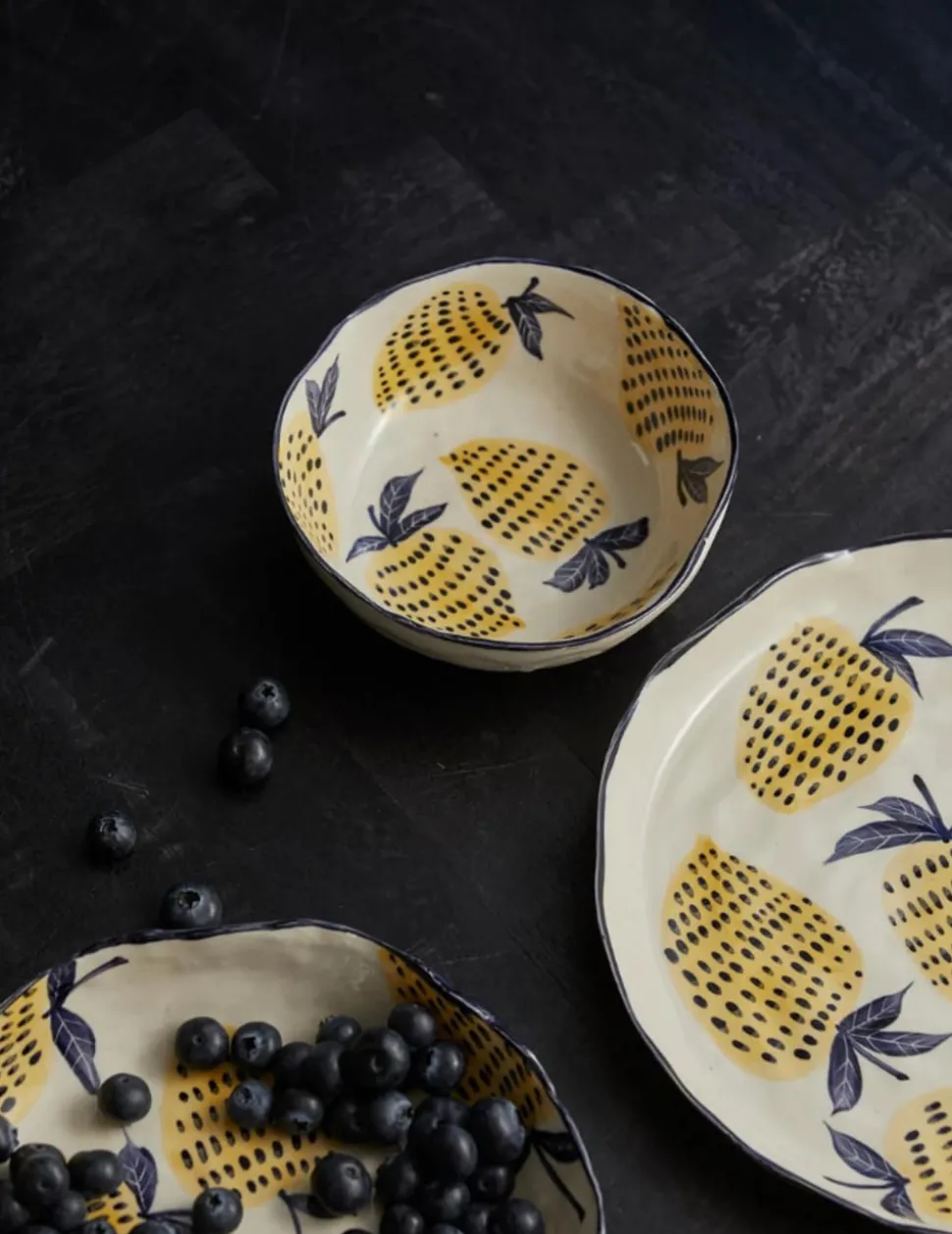 Diese drei unglaublich schönen Schalen sind Teil eines Services mit handgemalten Mustern in Farben, auf denen einige schöne gelbe Früchte zu sehen sind. Sie können diese drei Schalen für vieles verwenden. Da es drei verschiedene Größen gibt, ist es möglich, eine davon für genau die Mahlzeit zu verwenden, die Sie wünschen. In der kleinen Schale können Sie Joghurt, Haferflocken usw. essen. In der großen kann man kleine Kekse servieren, wenn man jemanden zu Besuch hat. Die Schale und die Teller sind glasiert und daher spülmaschinenfest und lebensmittelecht.