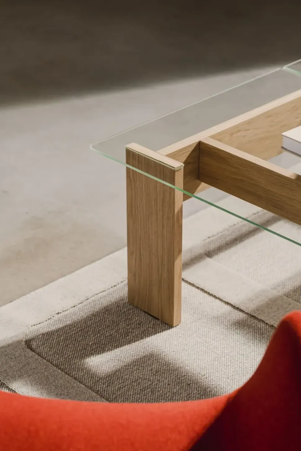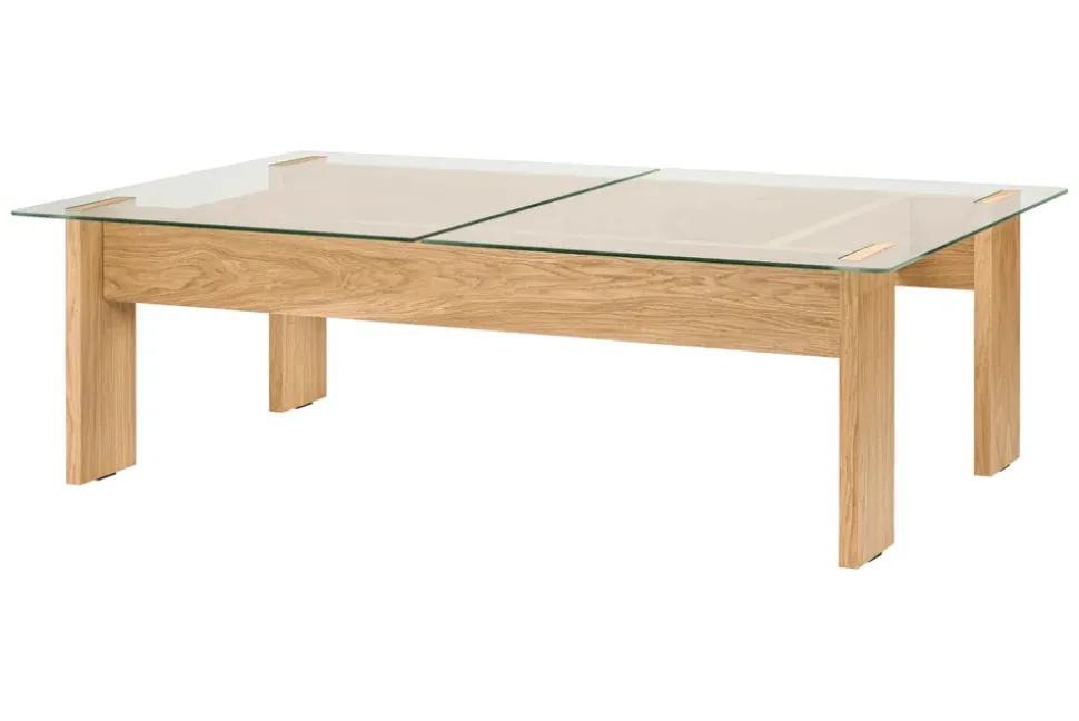 - Materialien: Beine: Eichenfurnier/Spanplatte; Platte: gehärtetes Glas.