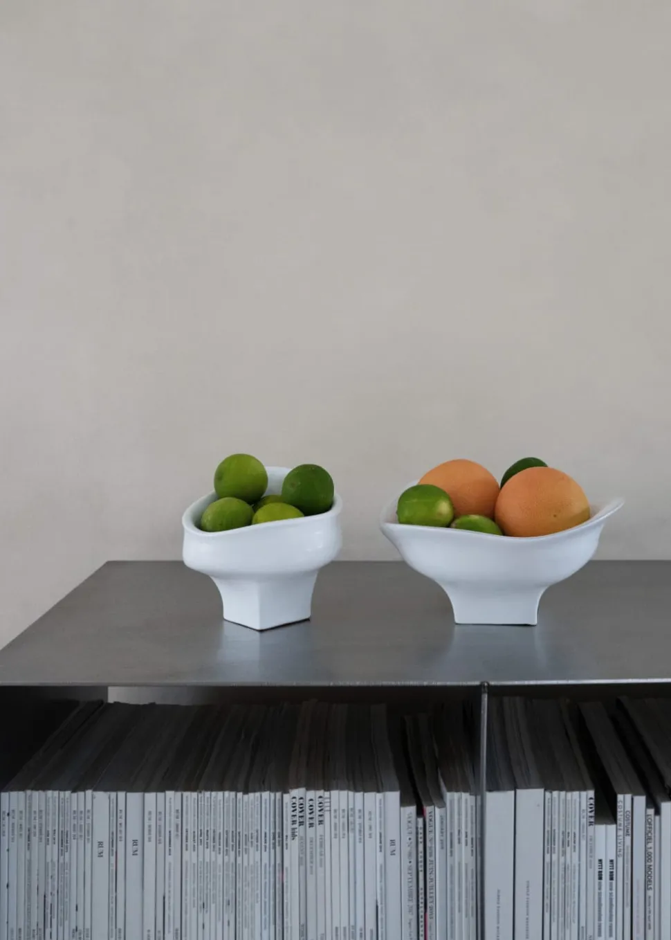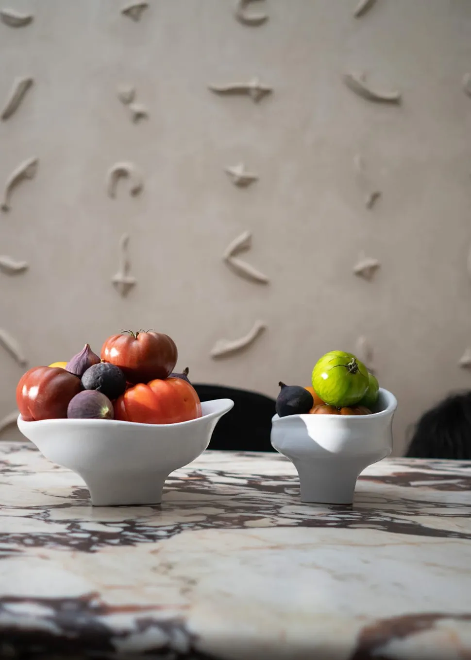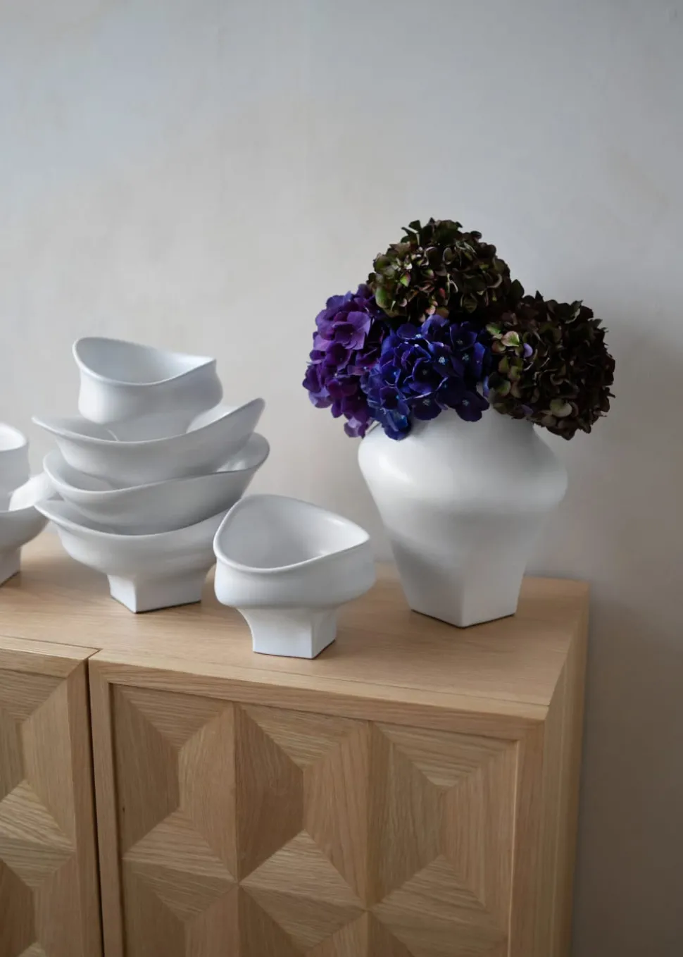 Die Schale Nami von , entworfen von Rebecca Hein, ist ein wunderbares Beispiel dafür, wie Handwerk auf Kunst trifft. Inspiriert von der traditionellen japanischen Keramikkunst zelebriert diese Kollektion die Schönheit der Einfachheit und integriert Wabi-Sabi-Elemente, um in jedem Raum eine ruhige Atmosphäre zu schaffen. Die asymmetrische Form, die die fließende Natur der Wellen widerspiegelt, verändert die Perspektive in jedem Winkel und macht jeden Blick einzigartig und fesselnd. Die Oberfläche ist mit einer beruhigenden weißen Glasur überzogen, die jedem Raum Leichtigkeit und Reinheit verleiht. Da alle Stücke in Portugal handgefertigt und glasiert werden, ist jede Schale ein Unikat mit leichten Abweichungen, die von der außergewöhnlichen Handwerkskunst zeugen.