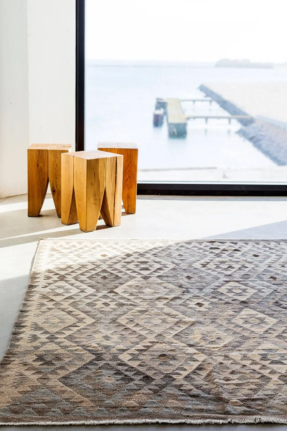 Natürliche Kelims sind handgewebte traditionelle Kelims, die aus hochwertiger afghanischer Wolle hergestellt werden. Aufgrund der Kombination von traditionellen Webmethoden und Mustern, gemischt mit naturfarbener Wolle, ist jeder Teppich schön und einzigartig.