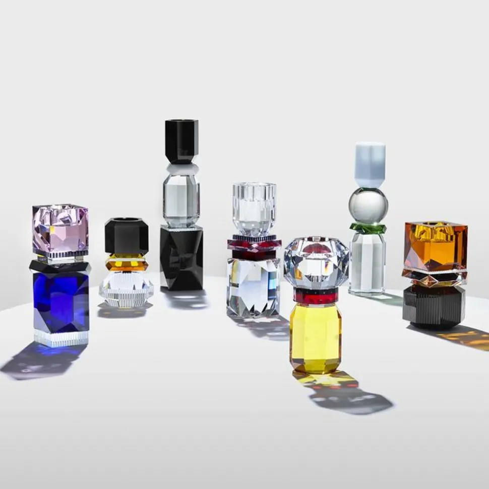 Der Kerzenhalter Nevada von besteht aus einer eleganten Kombination von verschiedenfarbigem Kristallglas mit einem würfelförmigen Design und geometrischen Kanten, die im Licht einen einzigartigen farbigen Schimmer erzeugen. Das Kristallglas des Stabes ist handgeschliffen und passt perfekt zu ähnlichen Glasdekorationen, die eine elegante Symphonie aus farbigem Glas ergeben.