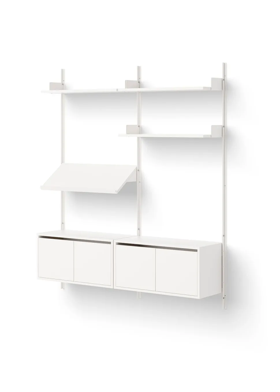 - Bestandteile: 2 x NW Wandstange, 1900 (2er Set), 3 x NW Standard Regalboden, 3 x NW Standard Regalträger, 1 x NW Magazinboden, 1 x NW Magazinbodenträger, 2 x NW Schrank niedrig mit Türen & 2 x Schrankträger.