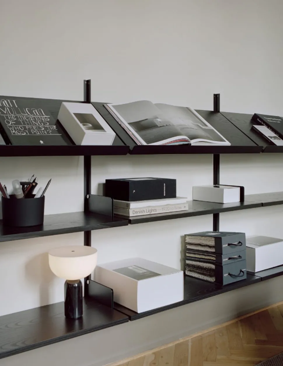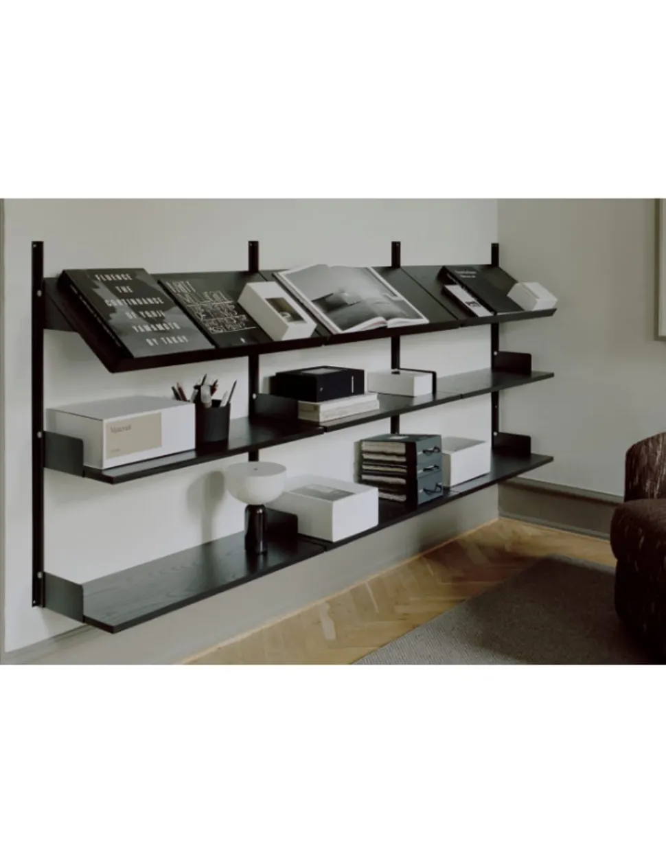 Exklusives Regal der skandinavischen Marke . Das Office Shelf ist das perfekte Regal für das Büro. Mit 4 Fachböden + 2 Schrägböden bietet es viel Stauraum für Bürozubehör und Präsentationsmöglichkeiten für offene und geschlossene Bücher.