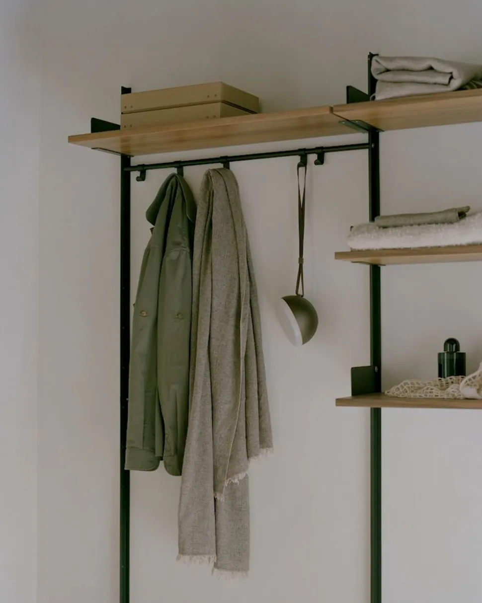 Dieses allumfassende Möbelstück kombiniert nahtlos eine Hutablage, einen Kleiderbügel, eine Schuhablage und eine Reihe von Haken. In Verbindung mit den Wandschienen und Regalen des Systems entsteht eine perfekt organisierte und optisch ansprechende offene Aufbewahrungslösung. Das Design zeugt von zeitloser Schlichtheit, die mit der charakteristischen Ästhetik von harmoniert, und verspricht, Ihre Garderobe in ein stimmiges Meisterwerk zu verwandeln.