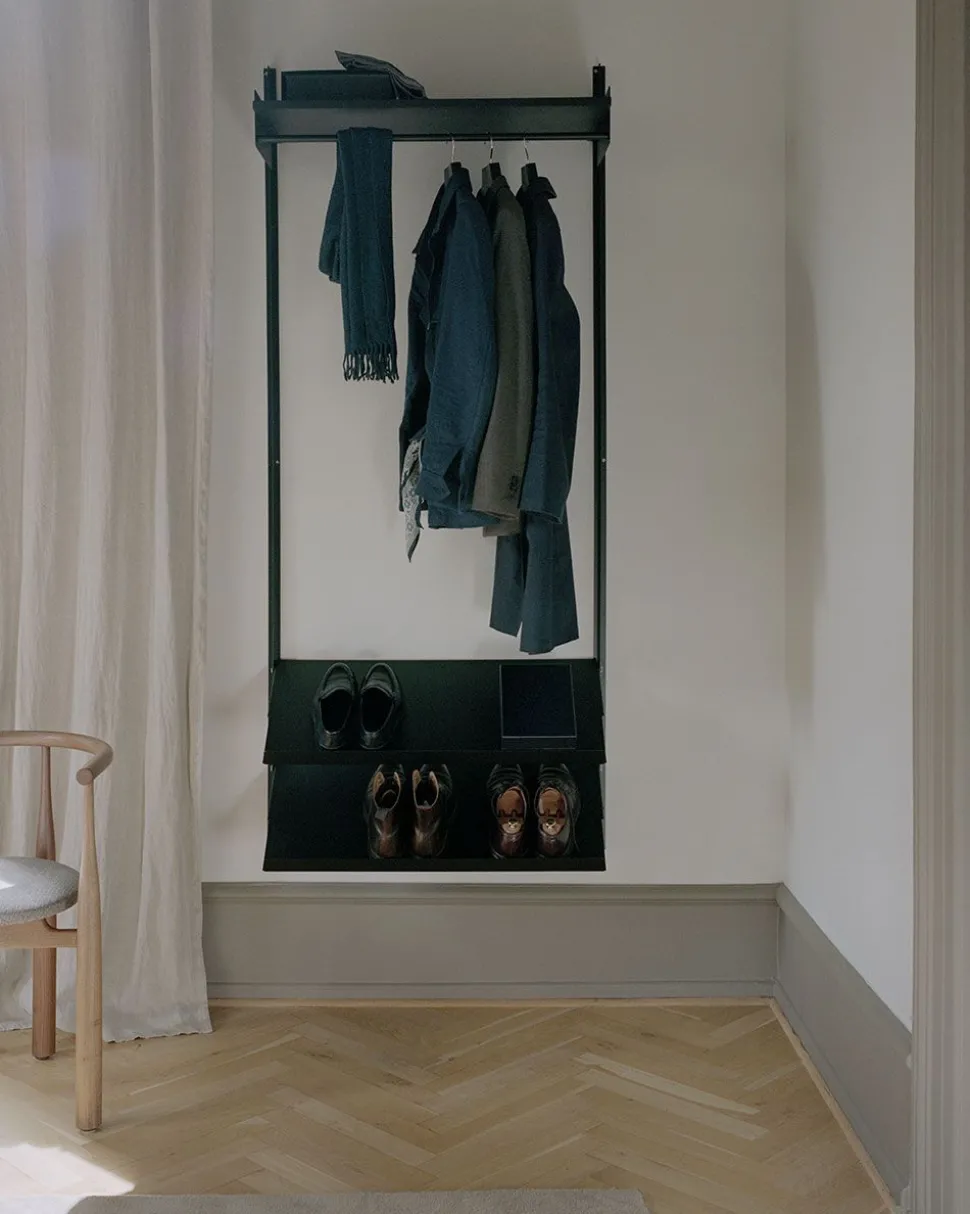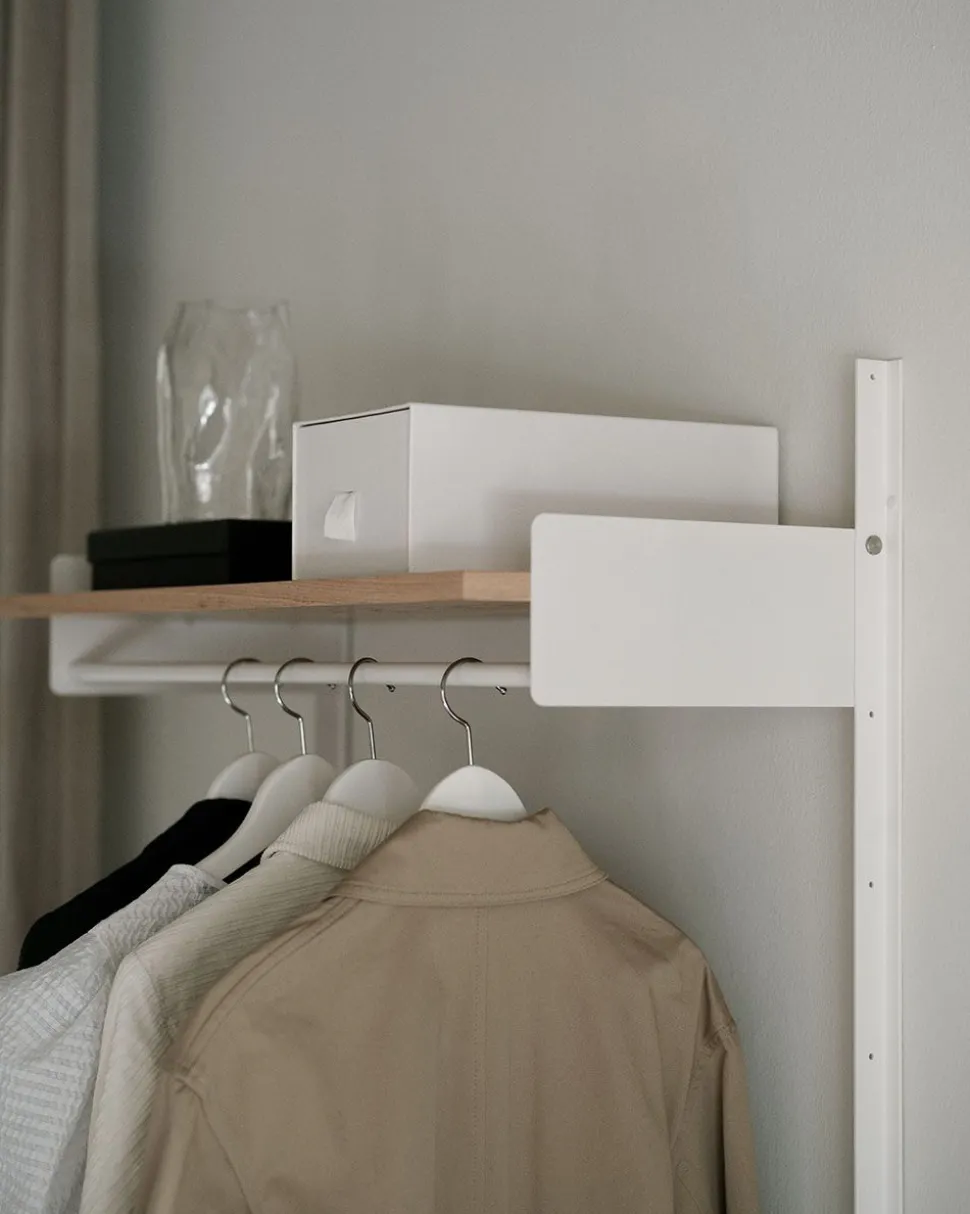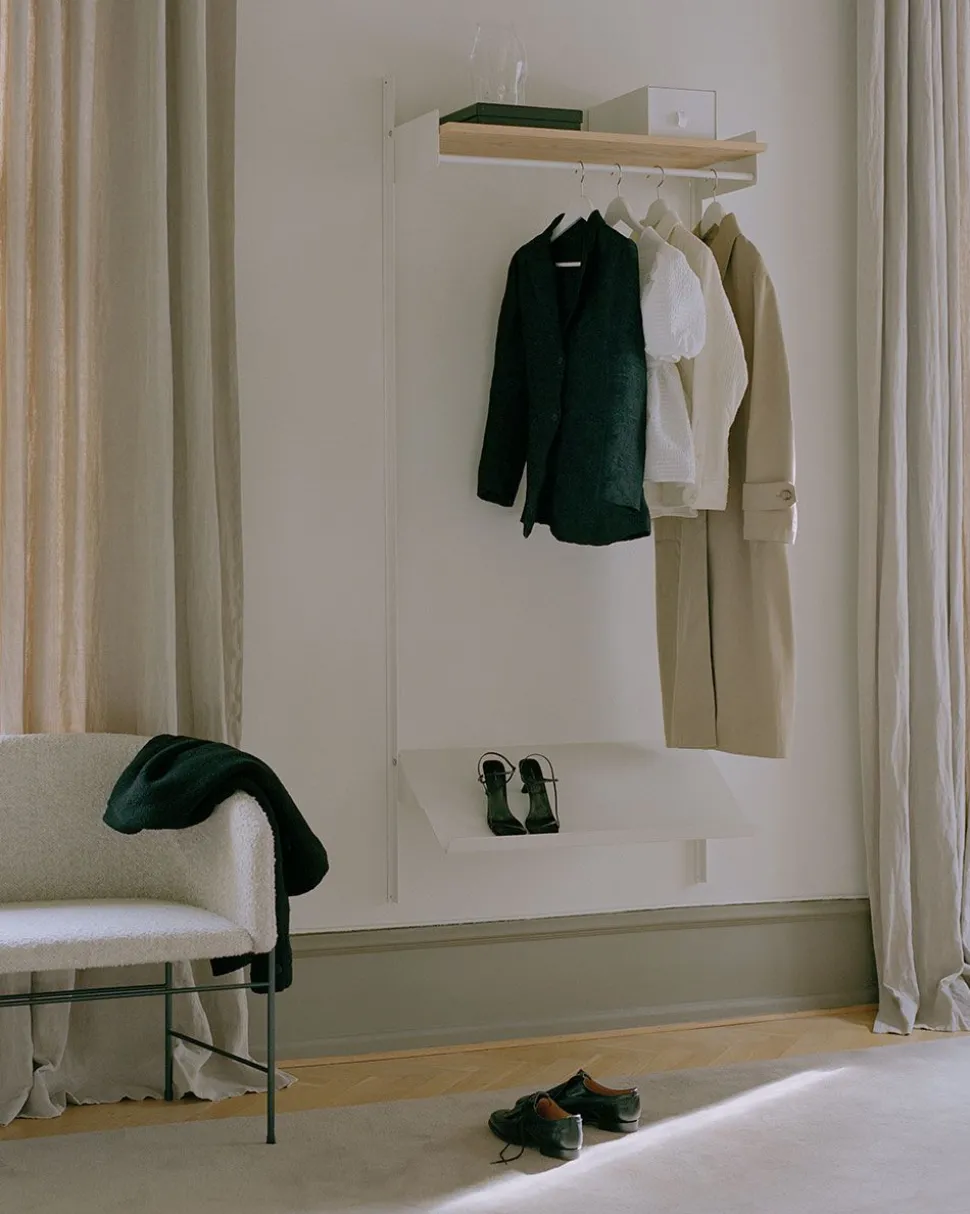 Das Wardrobe Shelf 1, das zu unserer Regalsystem-Kollektion gehört, hat ein tadelloses Design. Die sorgfältig aus hochwertigem MDF gefertigten Regalböden strahlen eine gewisse Raffinesse aus. Das robuste Trägersystem, eine Mischung aus Aluminium und Stahl, sorgt für Langlebigkeit und Stabilität und hebt sich damit vom Üblichen ab.