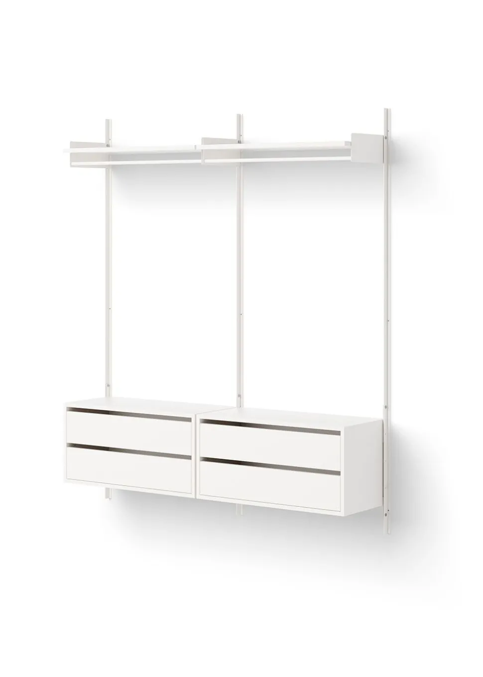 - Bestandteile: 2 x NW Wandstange, 1900 (2er-Set), 2 x NW Tiefes Regal, 2 x NW Regalhalter für Kleiderschrank, 2 x NW Schrank niedrig mit Schubladen & 2 x NW Schrankträger.