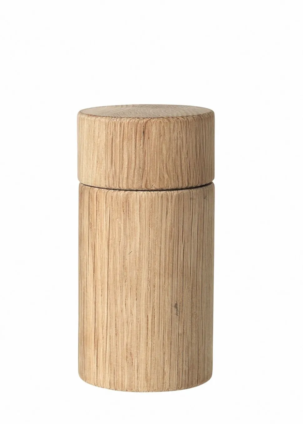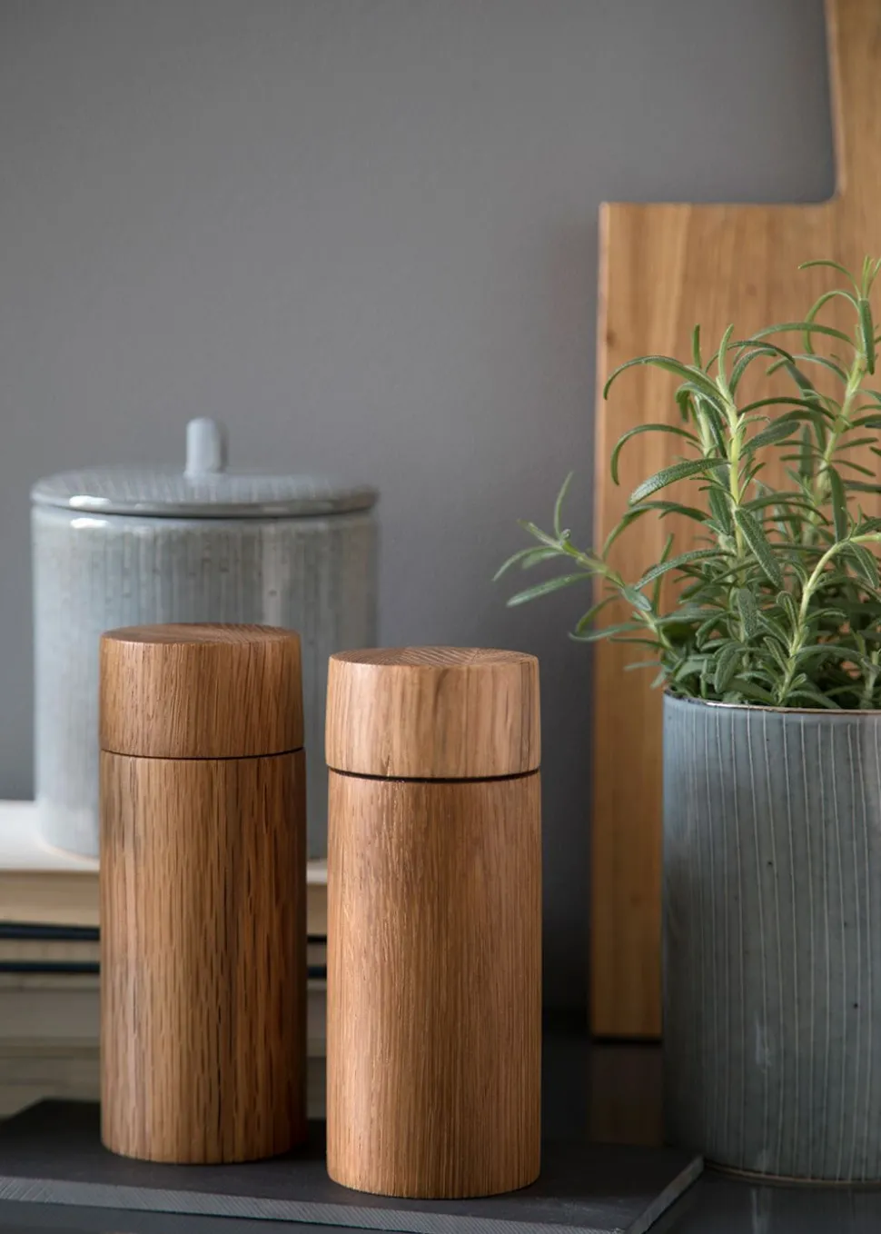 Einfache und klassische Gewürzmühle aus massiver Eiche. Kombinieren Sie sie entweder als Salz und Pfeffer oder verwenden Sie sie zu Ihren Lieblingsgewürzen des täglichen Lebens.