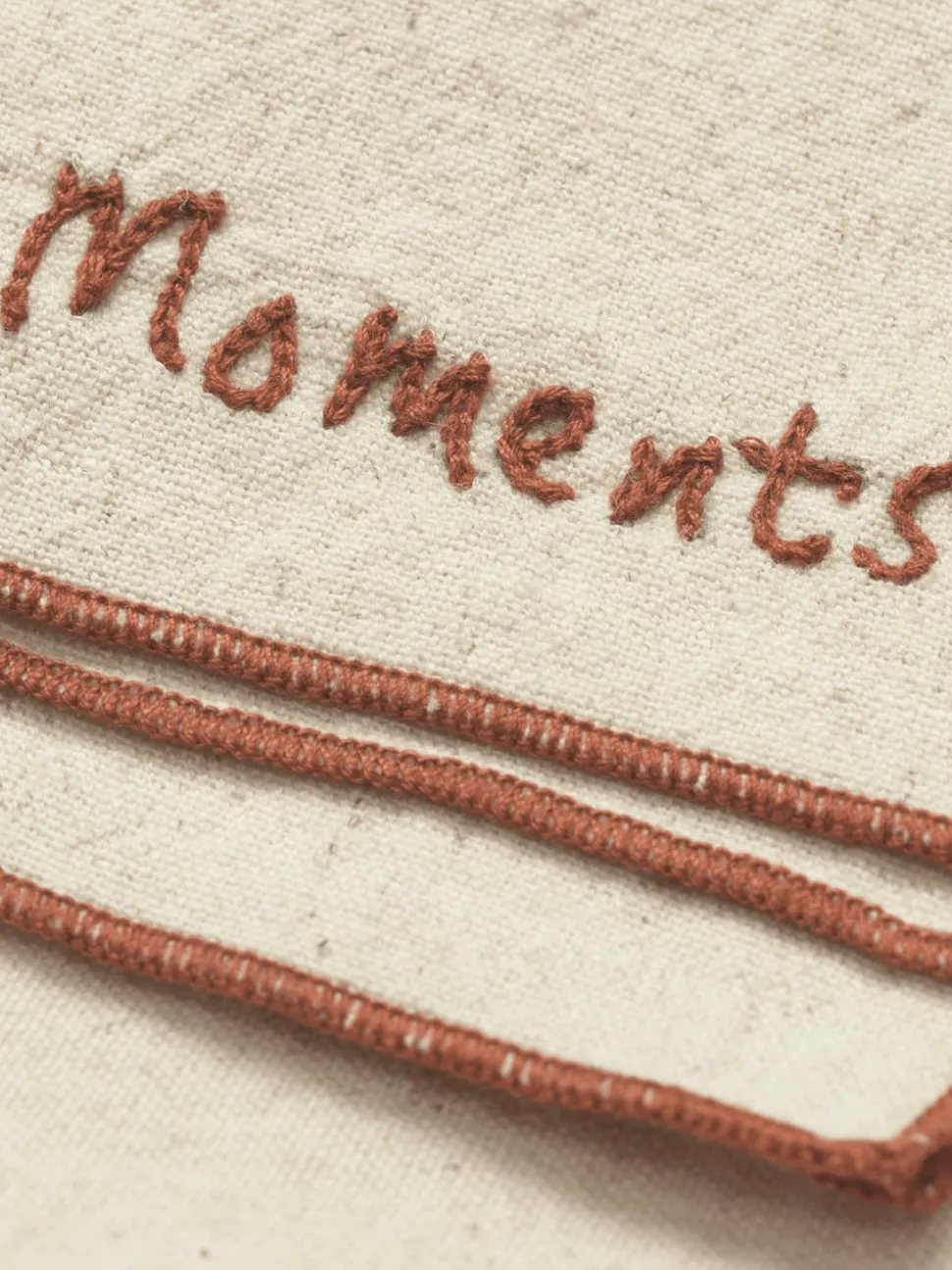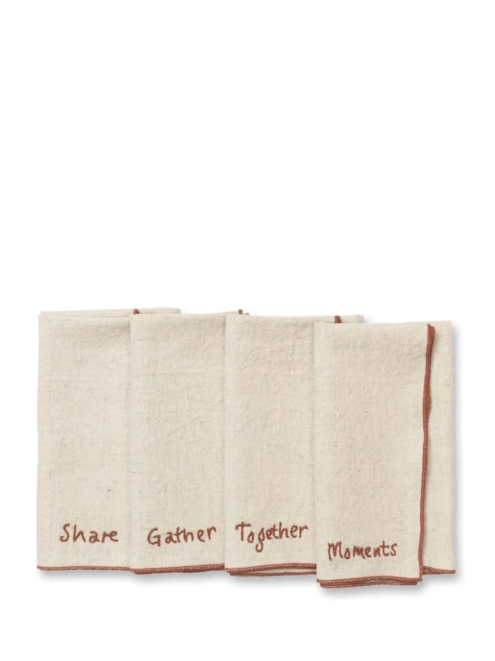 Auf diesen Servietten sind zarte Worte gestickt, die das Beisammensein bei einer Mahlzeit zelebrieren und das gemütliche und weiche Ambiente Ihres Tisches unterstreichen.