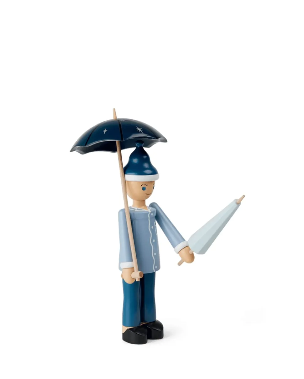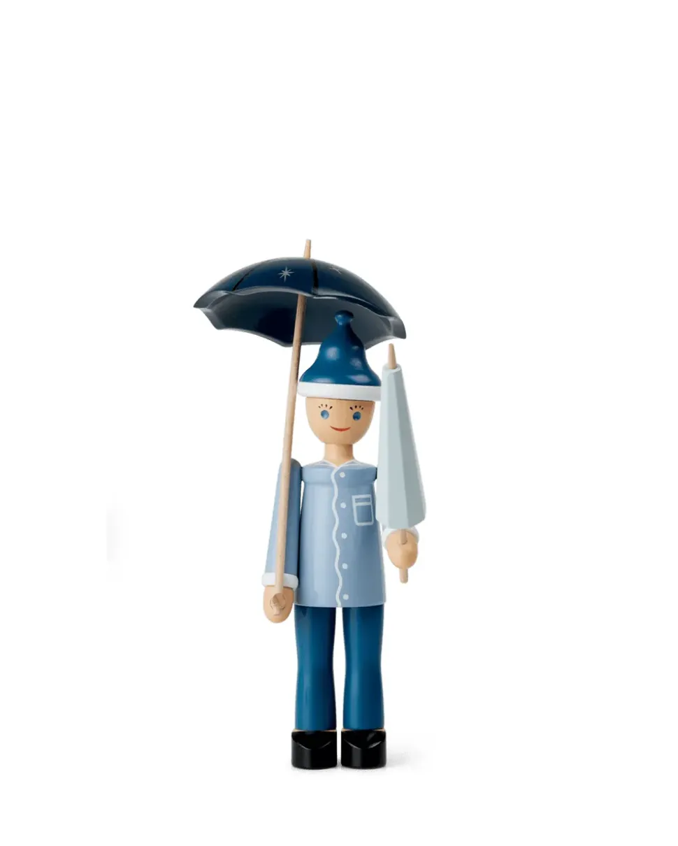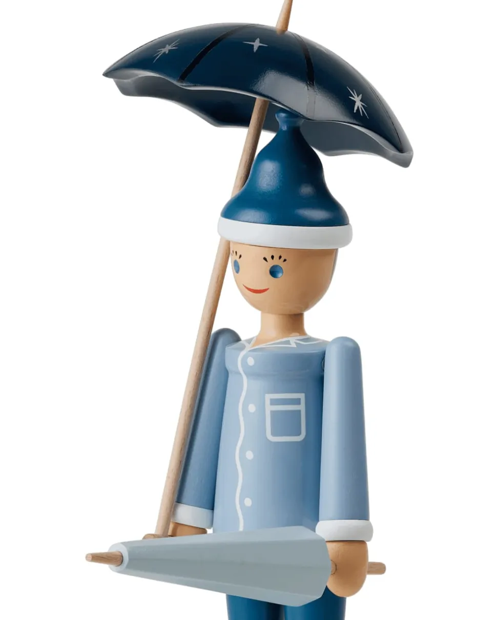 Klassischer Ole Lukøje in einer schönen bemalten Holzfigur. In einem hellblauen Nachthemd, einer dunkelblauen Nachthose, Hausschuhen und einem feinen Hut steht Ole Lukøje fröhlich mit seinen beiden Regenschirmen. Ole Lukøje passt perfekt in Kay Bojesens fantasievolles Universum, in dem er klassische Charaktere in wunderschönen nostalgischen Holzfiguren zum Leben erweckt.