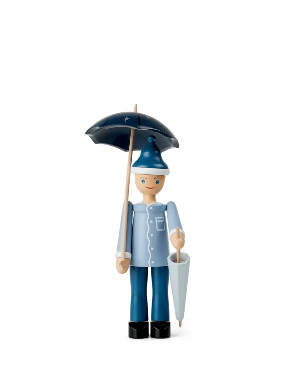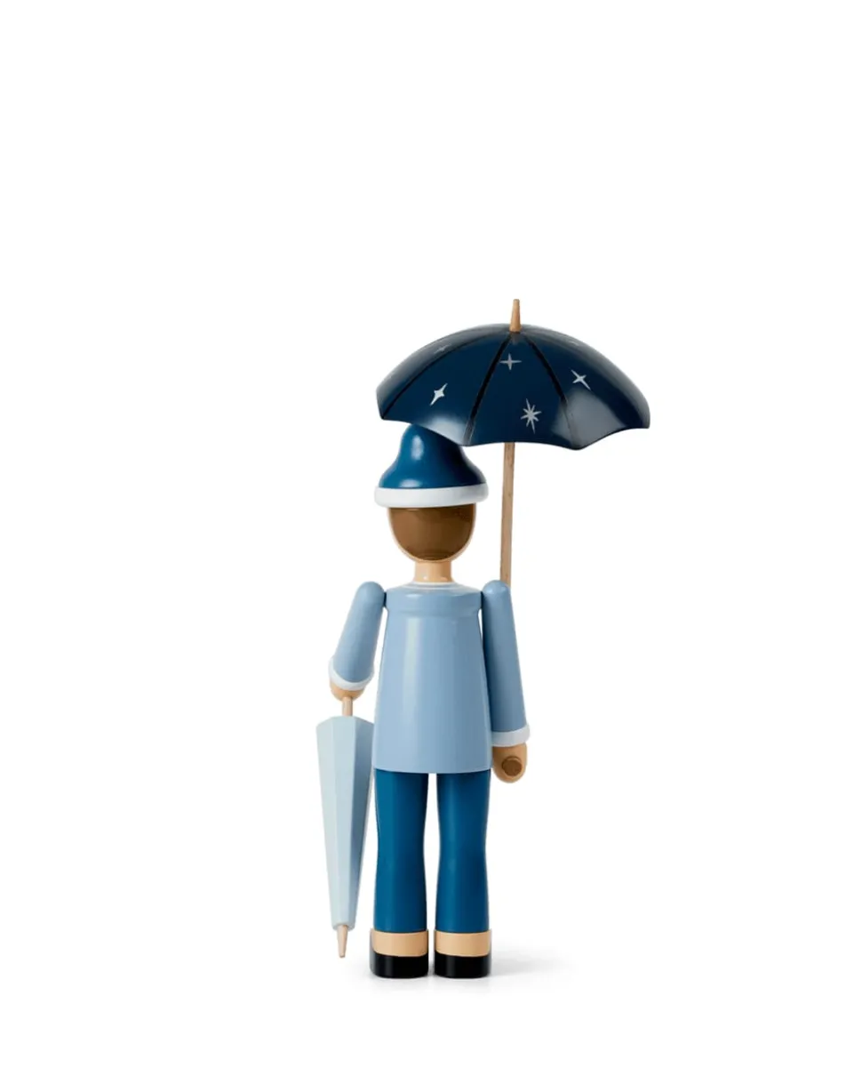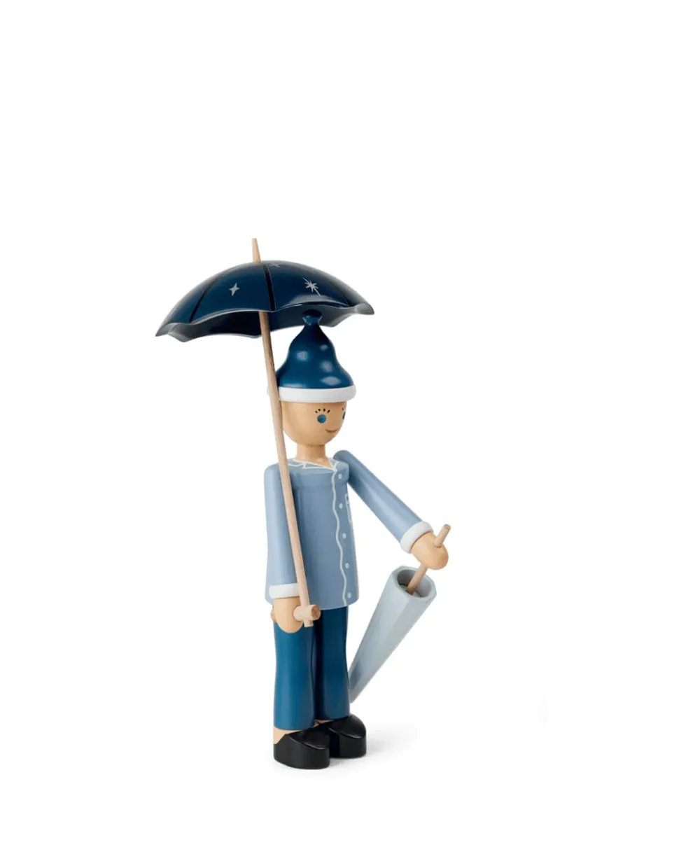 Klassischer Ole Lukøje in einer schönen bemalten Holzfigur. In einem hellblauen Nachthemd, einer dunkelblauen Nachthose, Hausschuhen und einem feinen Hut steht Ole Lukøje fröhlich mit seinen beiden Regenschirmen. Ole Lukøje passt perfekt in Kay Bojesens fantasievolles Universum, in dem er klassische Charaktere in wunderschönen nostalgischen Holzfiguren zum Leben erweckt.