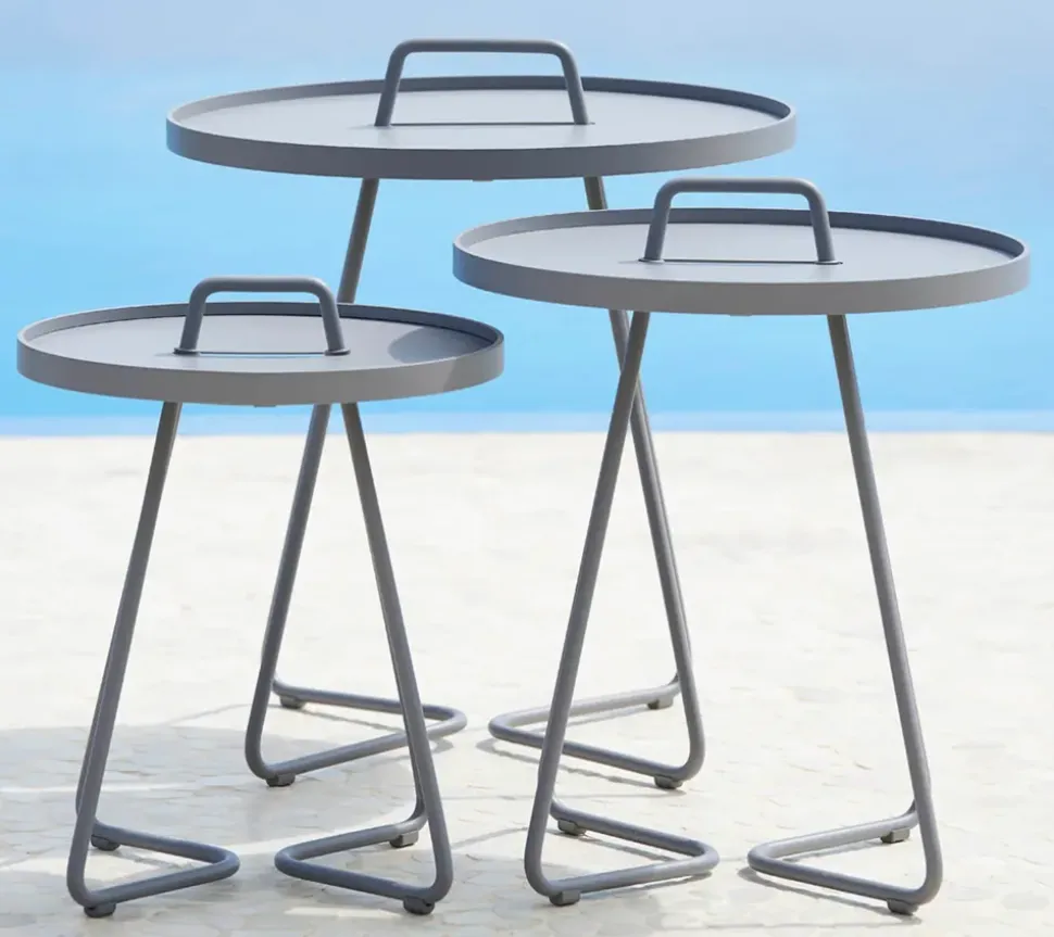 Die On-the-move-Serie wurde von Strand+Hvass entworfen und besteht aus leichten und eleganten Beistelltischen in verschiedenen Farben und Größen. Der Tisch ist aus Aluminium gefertigt und die Tischplatte ist abnehmbar und kann als Tablett verwendet werden. Die Beistelltische sind äußerst funktionell und elegant, da sie mit dem Griff leicht angehoben werden können.