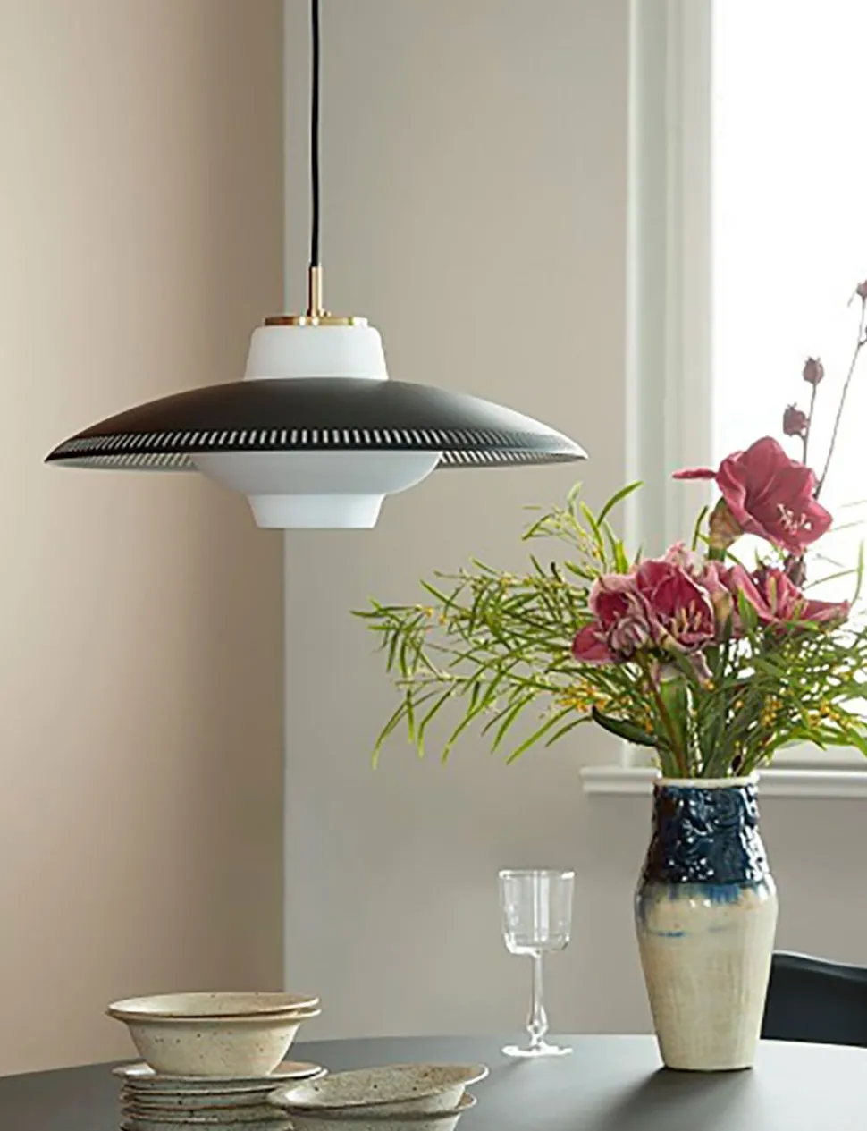 Opal Shade, entworfen vom dänischen Beleuchtungsdesigner Svend Aage Holm-Sørensen, basiert auf der Liebe, die viele Lampendesigner und Beleuchtungsmeister in den letzten Jahrzehnten für Opalglas empfunden haben. Das diffuse und gedämpfte Licht der Opal Glass schafft eine attraktive Atmosphäre, die zum Verweilen im Raum einlädt. Der breite Metallschirm der Leuchte trägt dazu bei, ein konzentriertes Licht über dem Tisch zu erzeugen, während die Rillen des Schirms dazu beitragen, den gesamten Raum in dem besonderen Licht zu erhellen, das Opalglas abgibt. Mit einer Auswahl an vertrauten Farben aus dem warmen nordischen Universum sowie raffinierten Messingdetails hat die Lampe einen retro-modernen Look, der sich leicht in der Wohnung einrichten lässt.