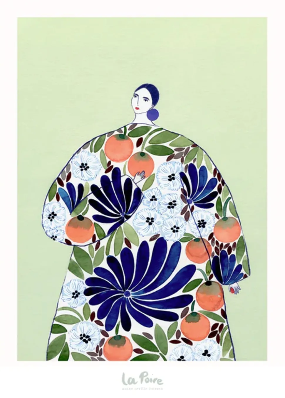 Schöne Frau mit langem, orangefarbenem Mantel. Das Plakat ist eine Reproduktion des Originalbildes „Orange Coat“ aus dem Jahr 2022. La Poire, die hinter dem Plakat steht, ist eine Künstlerin und Designerin, die seit ihrer Kindheit malt. Inspiriert wird sie von französischen Künstlern und sozialen Medien, von klassischen und zeitgenössischen Künstlern.