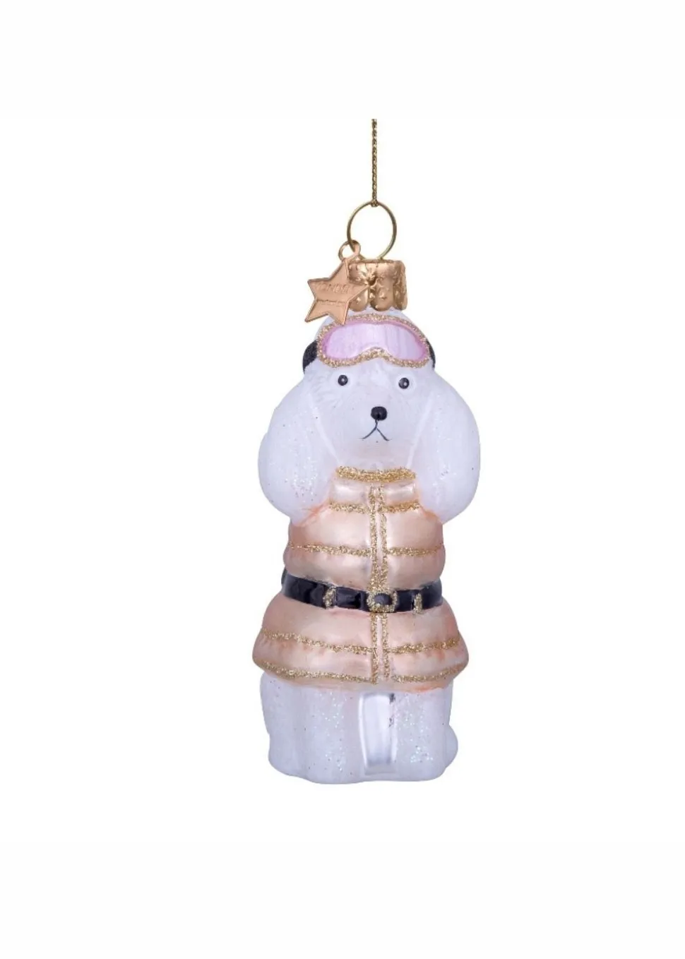 Das Ornament Glas weißer Pudel mit beigem T-Shirt von ist eine einzigartige und farbenfrohe Weihnachtskugel. Sein weißes Fell und das stylische beige T-Shirt bilden einen Kontrast zu dem niedlichen Pudel. Die feinen Details und die sorgfältige Verarbeitung machen diese Kugel zu einem Kunstwerk für sich, das Ihrer Weihnachtsdekoration eine einzigartige und bezaubernde Atmosphäre verleihen wird.