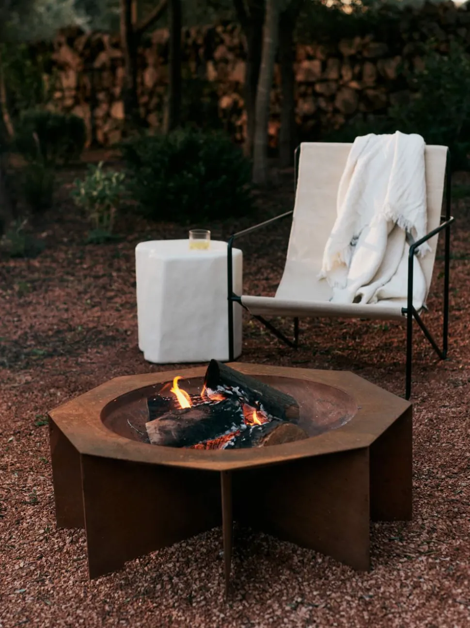 Otte Fire Pit von ist in Zusammenarbeit mit Utzon entstanden und weist klare architektonische Bezüge zu Jørn Utzons legendärer Designsprache auf. Die achteckige Form ist inspiriert von Can Lis, seiner privaten Residenz auf Mallorca, wo Natur und Architektur in harmonischem Gleichgewicht verschmelzen. Der aus robustem Cortenstahl gefertigte Kamin entwickelt im Laufe der Zeit eine schöne rostähnliche Patina, die seinen skulpturalen Ausdruck und seine natürliche Integration in den Außenbereich unterstreicht.