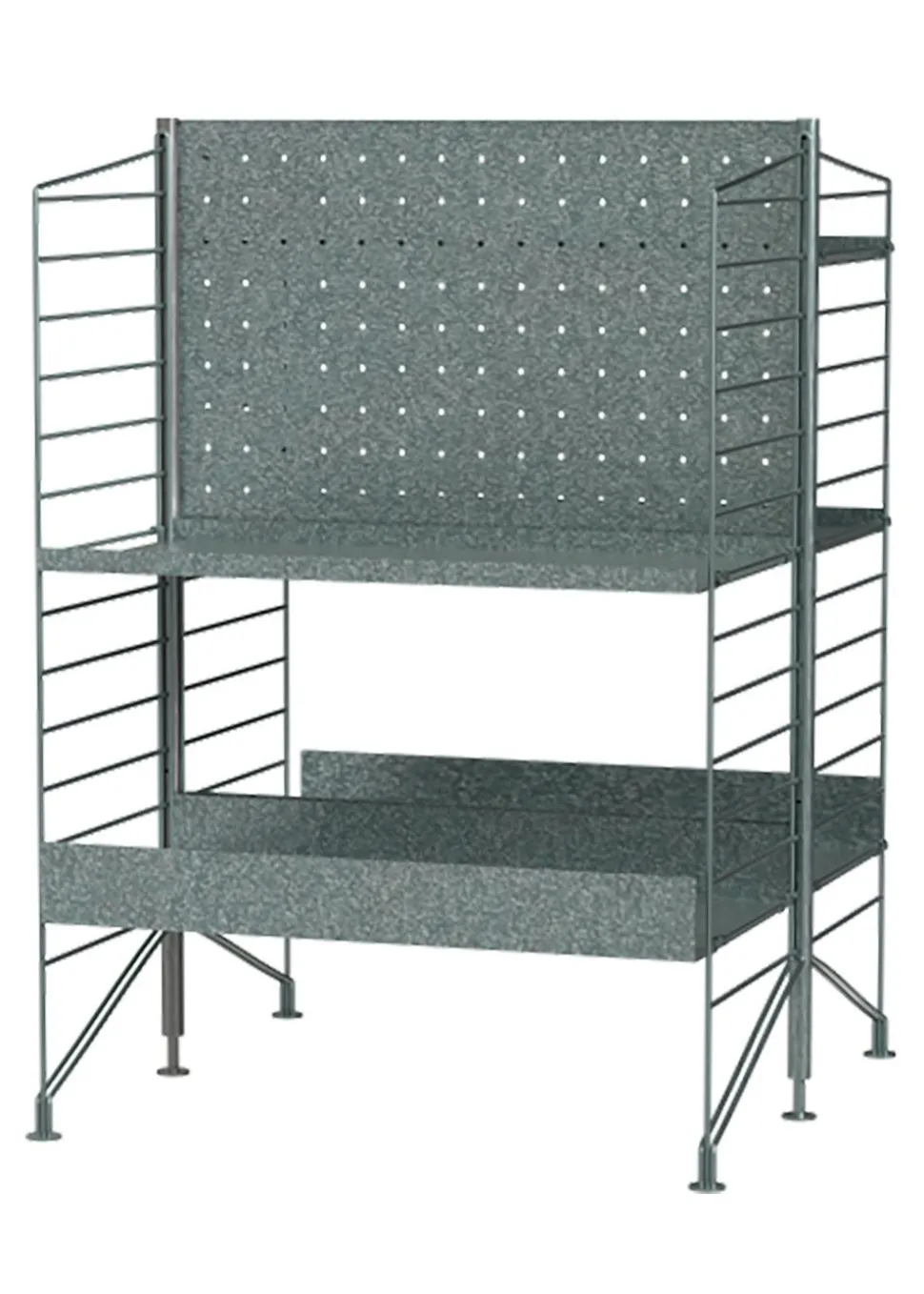 - Bestandteile: 2 x 2er-Pack Bodenplatte h85 x d30 cm | 2 x Ständer h87 x Ø2 cm verzinkt | 1 x Rückwand b58 x h36 cm verzinkt | 2 x Metallregal hoch b58 x d30 cm | 3 x Metallregal niedrig b58 x d30 cm.