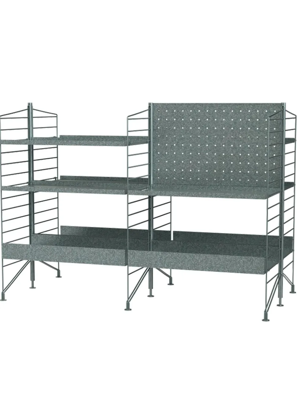 Outdoor L von ist die Krönung skandinavischer Designprinzipien, die jede Außenumgebung aufwerten und ergänzen. Das aus verzinktem Stahl und Aluzinkblech hergestellte Regalsystem verspricht nicht nur Langlebigkeit, sondern auch eine ästhetische Entwicklung zu einer schönen Patina im Laufe der Zeit. Seine mittelgroße, zweiteilige Kombination ist mit beidseitigen Regalböden für Symmetrie und funktionale Eleganz optimiert. Die unterschiedlichen Regalkanten verleihen dem Regal Charakter und zusätzliche Aufbewahrungsmöglichkeiten, ideal für alles von Blumentöpfen bis zu Gartengeräten.
