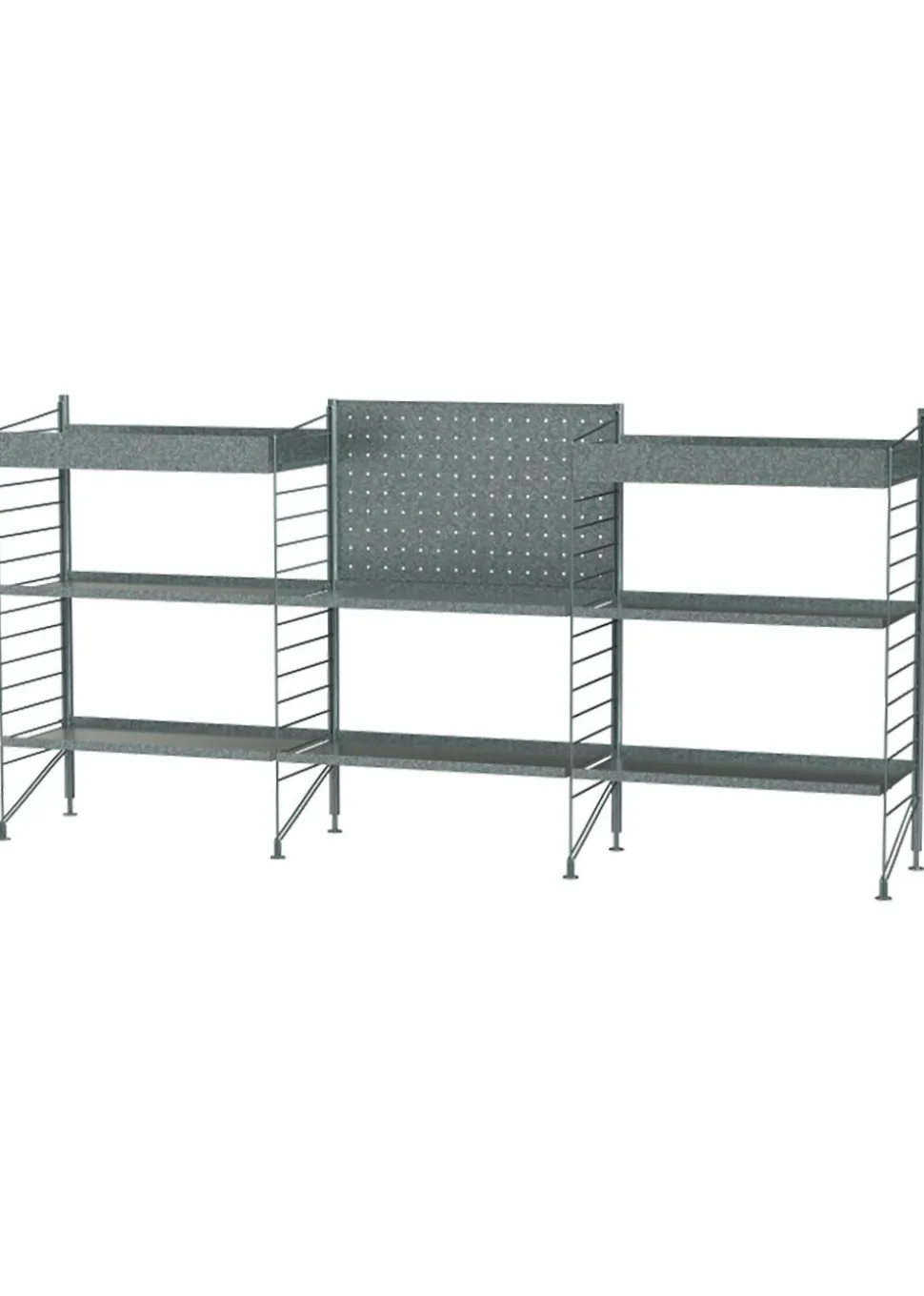 - Bestandteile: 4 x Ständer h87 x Ø2 cm verzinkt | 2 x 2er-Pack Bodenplatte h85 x d30 cm | 1 x Rückwand b58 x h36 cm verzinkt | 2 x Metallregal hoch b58 x d30 cm | 6 x Metallregal niedrig b58 x d30 cm.