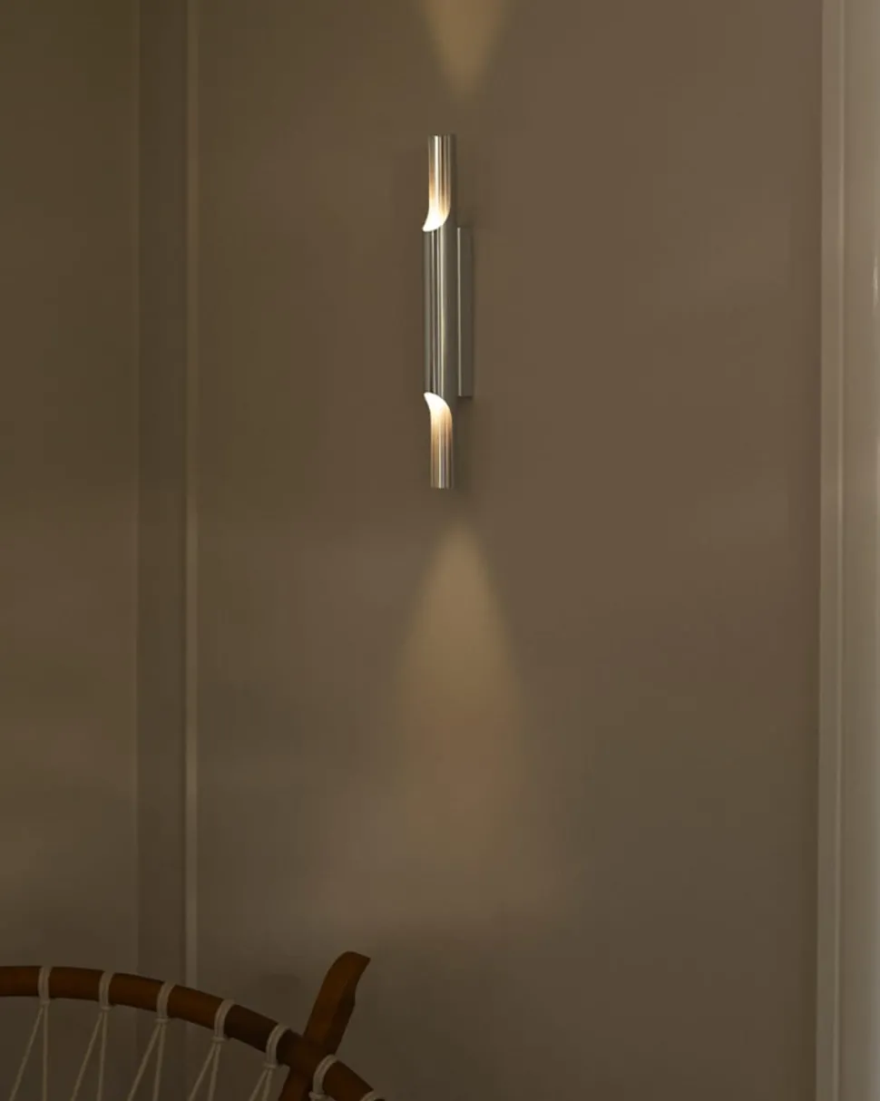 Die Pan Wall Wandleuchte von , entworfen von Bent Karlby, ist eine raffinierte Interpretation der ikonischen Designsprache der 1970er Jahre. Die aus eloxiertem Aluminium gefertigte und durch ihre röhrenförmige Silhouette gekennzeichnete Leuchte erzeugt ein charakteristisches Lichtmuster, bei dem das weiche Licht durch Öffnungen an der Ober- und Unterseite herausgefiltert wird. Das Prinzip der versteckten Lichtquelle sorgt für einen blendfreien Ausdruck und verleiht jeder Wand eine fast grafische Präsenz. Pan Wall ist Stimmungsmacher und skulpturales Objekt zugleich und verbindet Funktionalität und dekorativen Wert in einem zeitlosen Ausdruck.