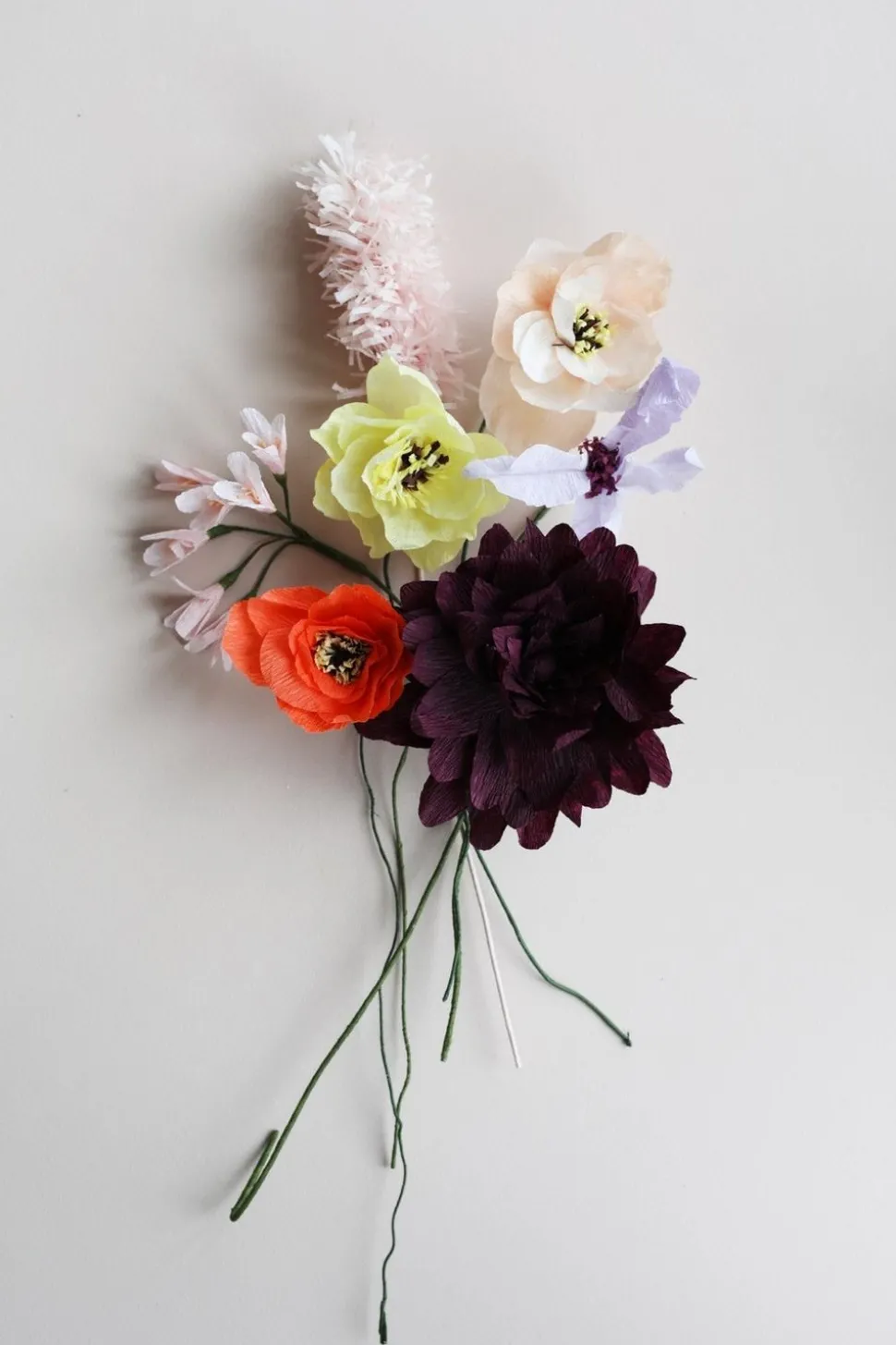 Geben Sie den Papierblumen Leben und Charakter, indem Sie die Blätter formen, einen Teil der Blütenköpfe geschlossen lassen und die Stiele biegen, so dass jede Blume ihren eigenen Ausdruck erhält. Sie eignen sich auch sehr gut zum Mischen mit Trockenblumen, die Sie dann je nach Jahreszeit und Stimmung wechseln und kombinieren können.