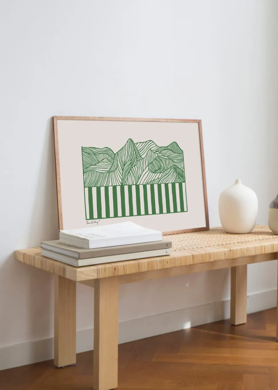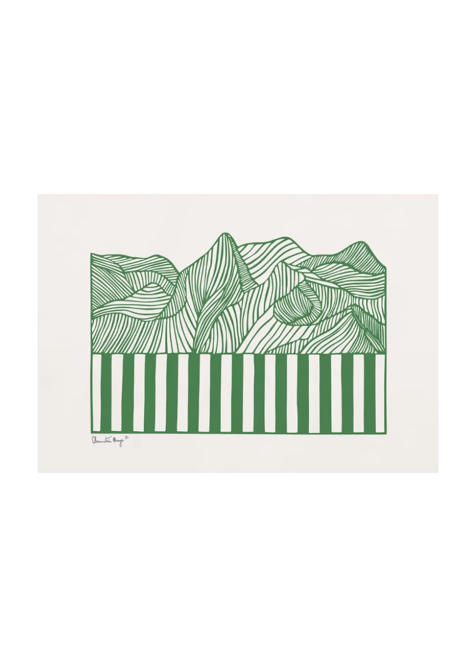 Das Plakat ist exklusiv für in höchster Qualität gestaltet. Das Plakat besteht aus einem zweiteiligen grafischen Motiv mit einem unteren Teil aus gestreiften Balken und einem oberen Teil mit abstrakten Bergumrissen. Die Motive sind in kräftigen Farben gehalten und mit einem Hintergrund im gleichen Farbton versehen, was dem Plakat ein einzigartiges Gesamtbild verleiht.
