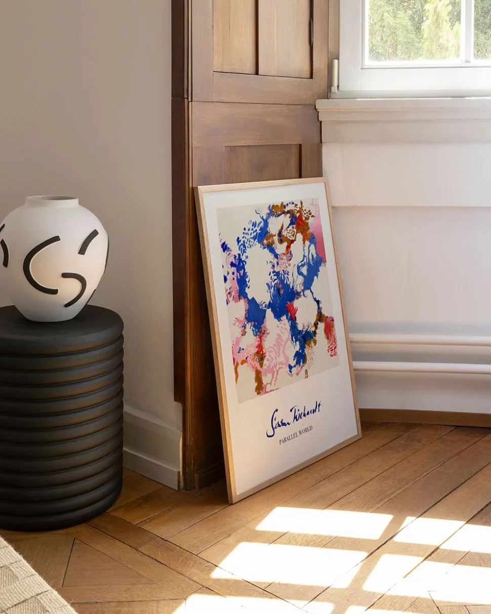 Das Plakat besteht aus einem grafisch illustrierten Motiv, das Farben in einer emotionalen Explosion kombiniert. Die gewellten Linien, undefinierbaren Formen und intensiven Farben bringen die einzigartigen kreativen Grundformen des dänischen Designs zum Vorschein.
