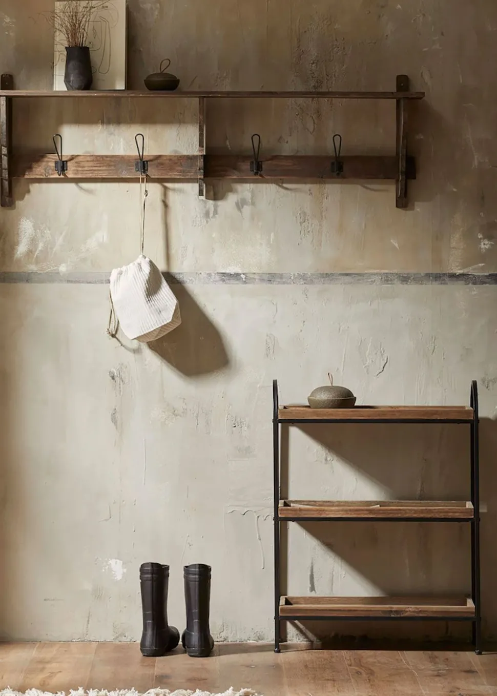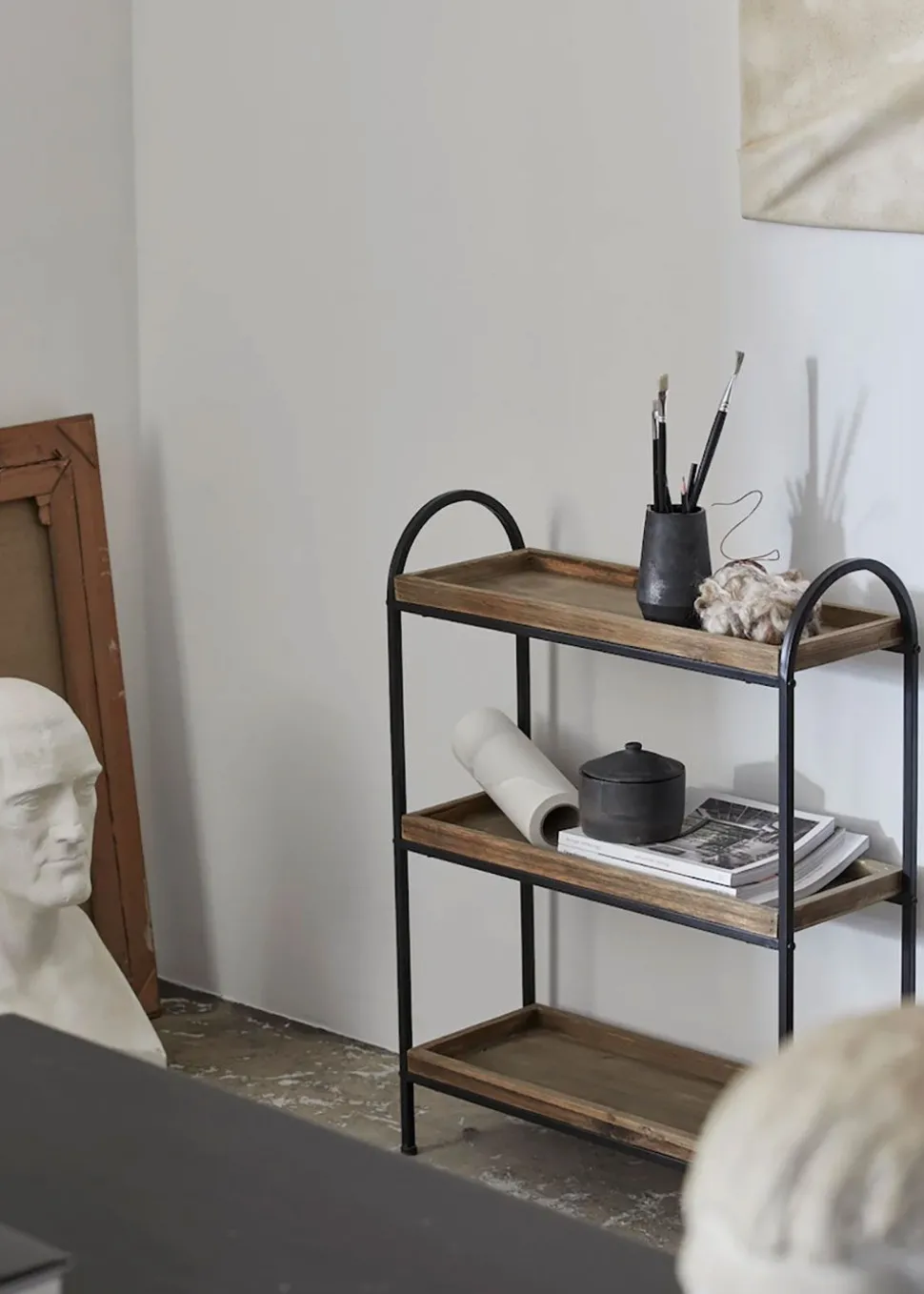 Das Patna Iron Rack von ist eine rustikale und schlichte Aufbewahrungslösung mit einem einzigartigen Look. Das Regal hat einen schwarz lackierten Eisenrahmen und Einlegeböden aus recyceltem Holz, die jedem Raum einen warmen und charmanten Touch verleihen. Mit seinen drei Regalböden bietet PATNA ausreichend Platz, um Ihre Gegenstände zu ordnen und eine saubere und aufgeräumte Umgebung zu schaffen.