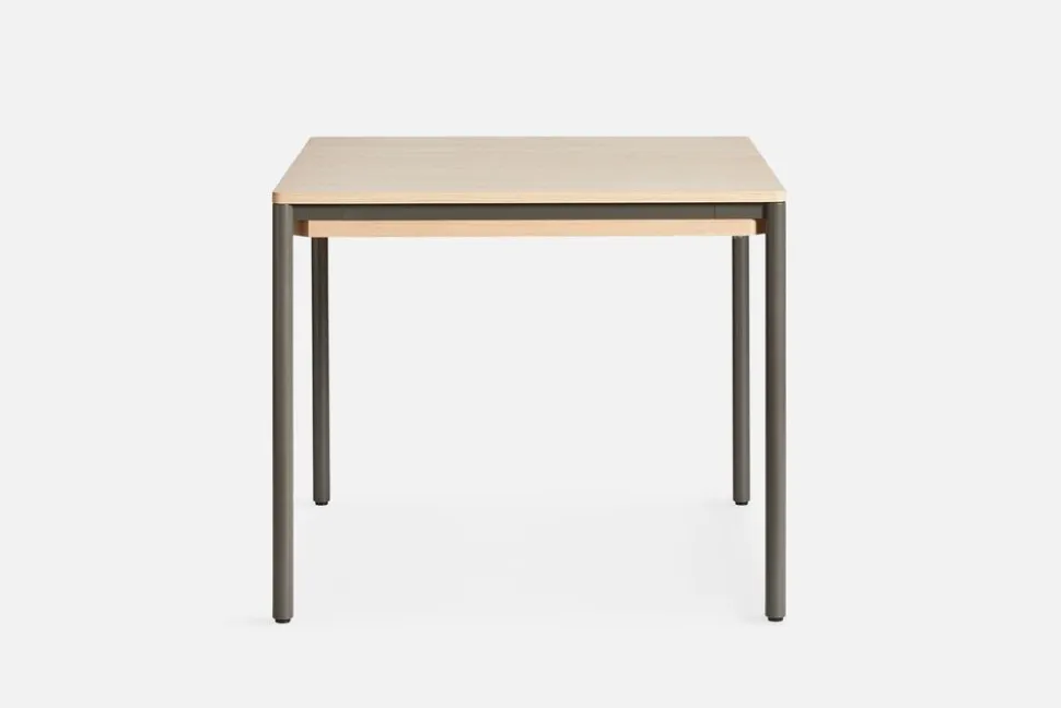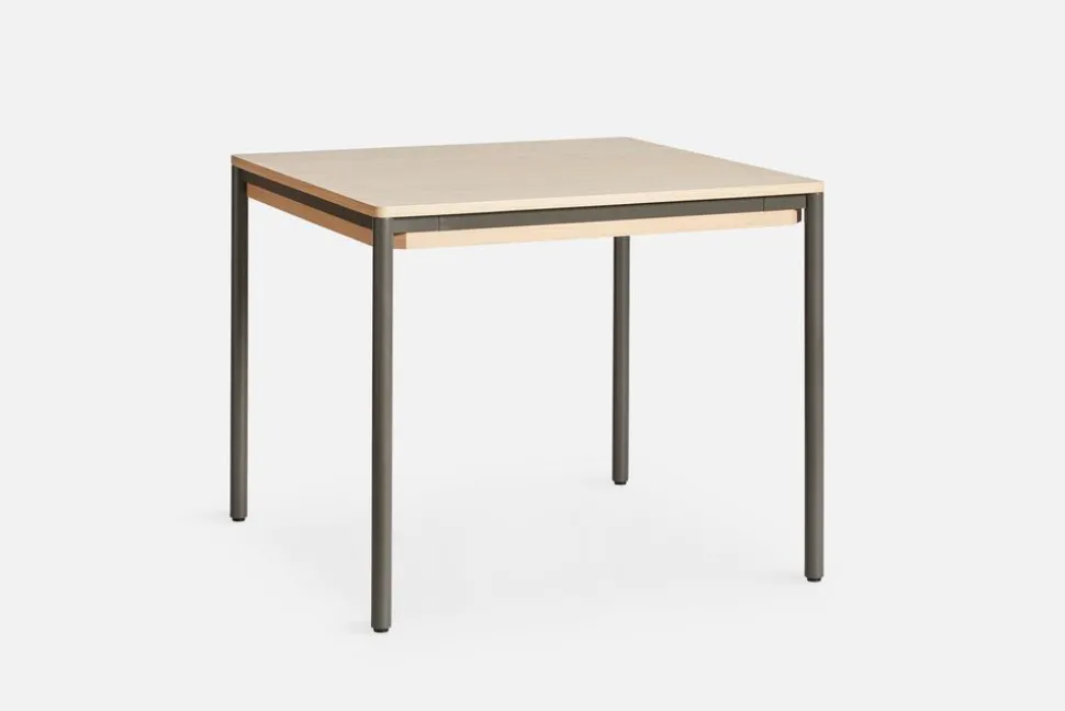Der Piezas Esstisch von hat ein schlichtes Design mit einer weiß pigmentierten, lackierten Eichentischplatte und grau lackierten Metallbeinen.