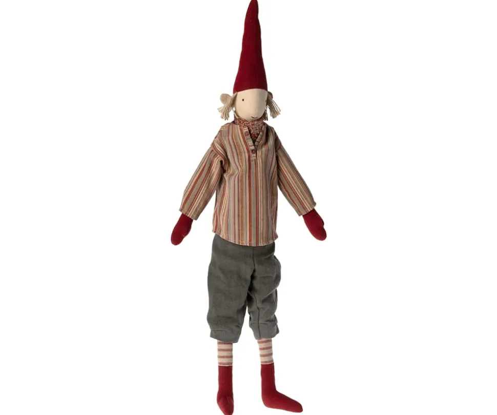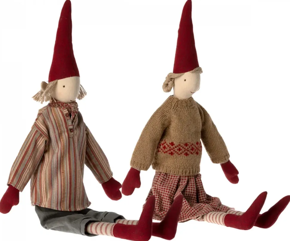 Pixy Size 4 von ist ein bezauberndes Set von Elfen, die beide in wunderschöne Weihnachtsoutfits aus exklusiven Materialien gekleidet sind. Die feinen Details ihrer Outfits, von den gestreiften Socken bis zu den handgestrickten Pullovern, sorgen für eine nostalgische und gemütliche Atmosphäre in Ihrem Zuhause während der Weihnachtszeit.
