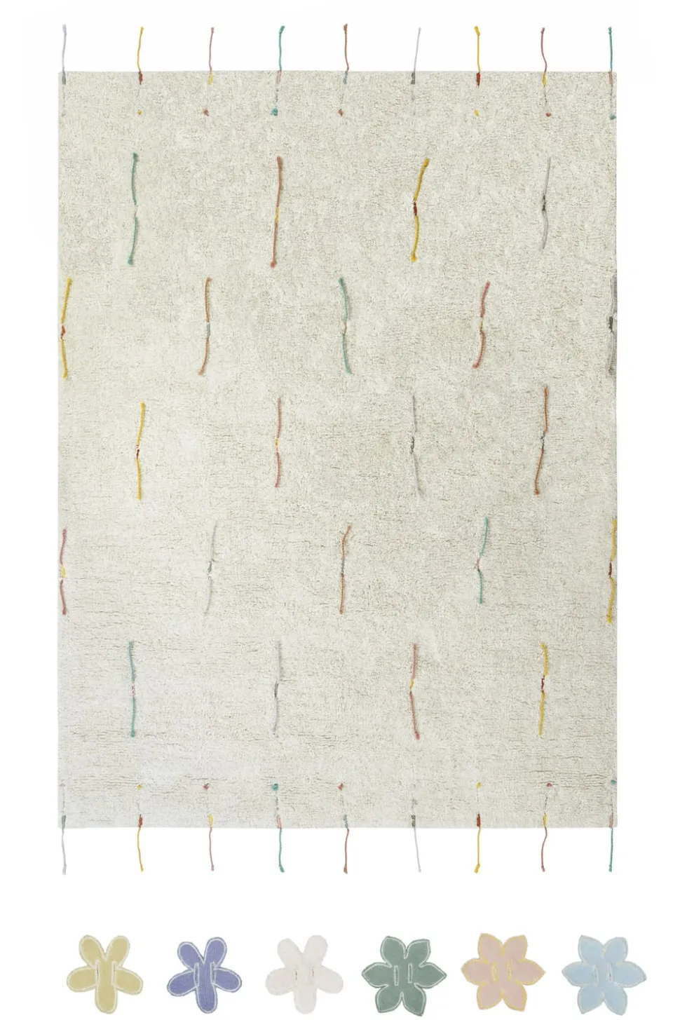 Tauchen Sie ein in eine Welt voller blühender Fantasie mit der Wildflowers Playmat von . Dieser weiche, elfenbeinfarbene Baumwollteppich wurde mit Sorgfalt und Kreativität handgefertigt und lädt die Kleinen ein, ihren inneren Gärtner zu entfesseln. Mit den aufgestickten bunten Fäden entlang der Ränder und über den ganzen Teppich verstreut, bietet er eine einzigartige Möglichkeit, die Blumen selbst anzubinden und so einen lebendigen und sich ständig verändernden Garten zu schaffen.