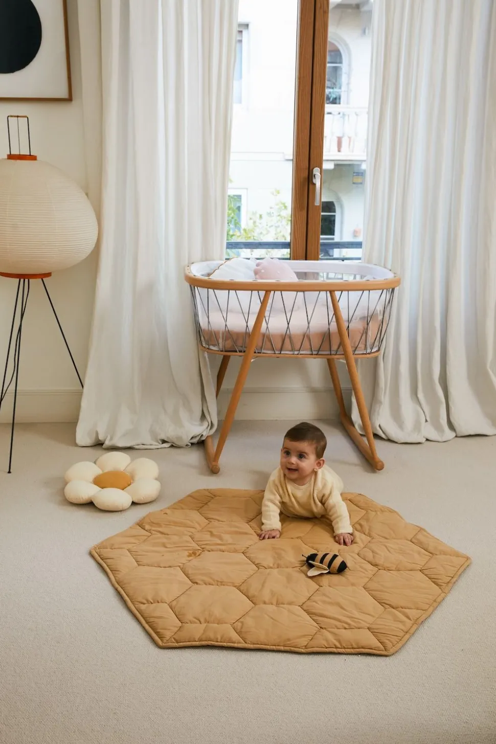 Bringen Sie mit diesem Spielteppich von einen Hauch von Natur in die Spielwelt Ihres Kindes. Dieser einzigartige Spielteppich hat die Form einer Bienenwabe und ist mit dem unverwechselbaren sechseckigen Muster gesteppt. Er besteht aus weicher Bio-Baumwollpopeline in einer warmen Honigfarbe. Gefüllt mit weicher, recycelter Polyfill-Füllung bietet er eine bequeme und sichere Oberfläche für Ihr Kind zum Erkunden, Spielen und Lernen. Der Teppich ist nicht nur eine Augenweide, sondern auch ein Fest für die Sinne, dank des mitgelieferten zweiförmigen Rasselspielzeugs, das mit knisterndem Papier und einem einladenden Rasselgeräusch lockt. Nutzen Sie ihn als sicheren Spielbereich, in dem Ihr Kind stundenlang entdecken, berühren und fühlen kann.