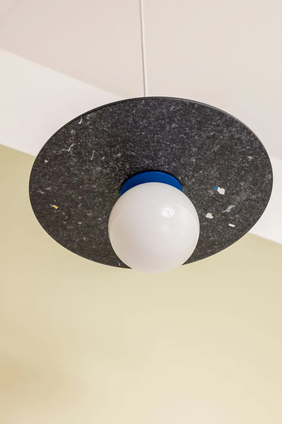 Die PLUTO LITTLE Pendelleuchte von , entworfen von Louise Hederström, kombiniert recycelten Kunststoff und pulverbeschichteten Stahl mit einer eleganten Glaskugel, die einen schönen Kontrast zwischen rohen und edlen Materialien schafft. Mit ihrem tiefschwarzen Schirm strahlt diese Leuchte eine moderne und raffinierte Ästhetik aus, in der sich Qualität und Nachhaltigkeit in einem exquisiten Design vereinen. Das feine textilummantelte Kabel verleiht dem Gesamtbild zusätzliche Eleganz.