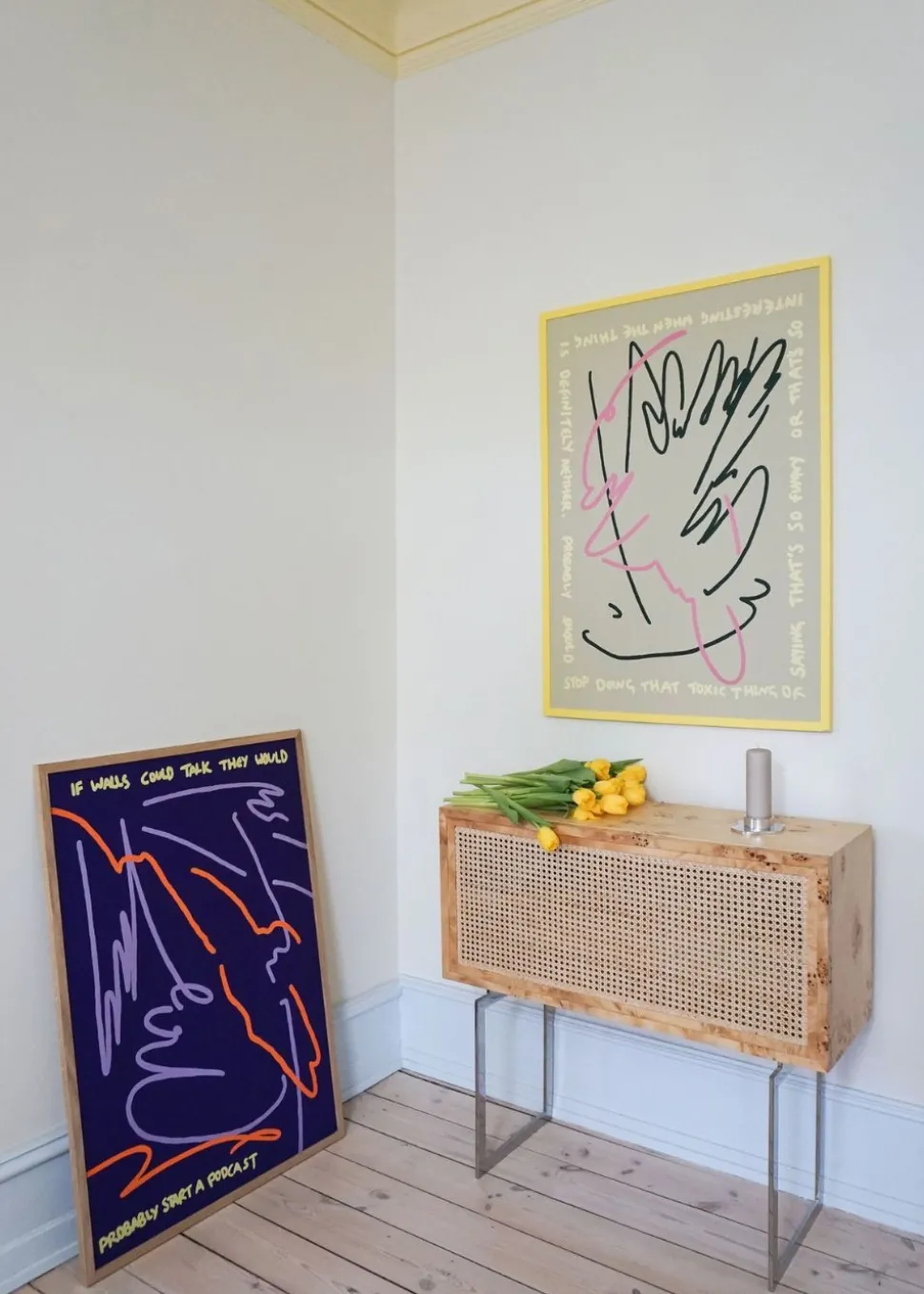 Der von der Künstlerin Jenny Beard entworfene Podcast ist ein farbenfrohes Poster mit vielen verschiedenen Details und Linien, die auf einzigartige Weise kombiniert sind. Die schöne lila Farbe kann eine schöne und anspruchsvolle Ergänzung für jedes Zuhause sein.