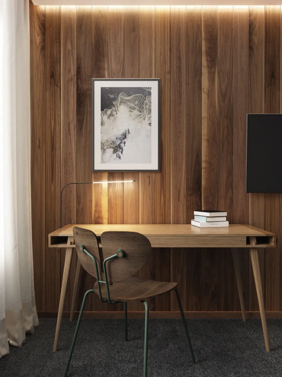 Poet Desk von mit klassischem Design und eleganten stromlinienförmigen Linien. Die Form des Tisches ist so gestaltet, dass er mit einem durchgehenden Regal und einer Schublade das Notwendigste aufnehmen kann. Eine schöne Handwerkskunst mit modernen und minimalen Details, die dem Tisch ein exklusives Aussehen verleihen.