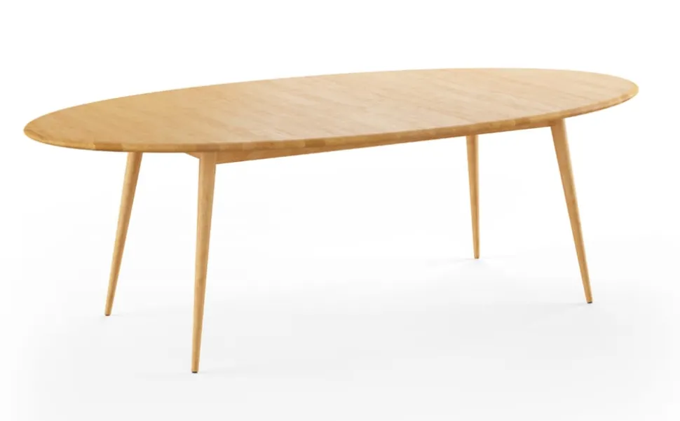 Dieser Esstisch hat eine schlanke, abgerundete Tischplatte und charakteristisch verjüngte Beine. Der Tisch ist aus hochwertigem Holz gefertigt und betont die natürlichen Maserungen und Strukturen, die die bemerkenswerten Qualitäten des Materials zur Geltung bringen.