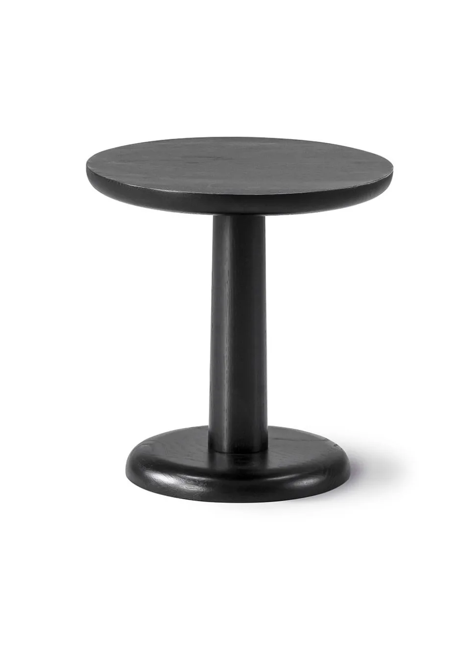 Der Tisch ist aus drei einfachen Komponenten aufgebaut, die zusammen ein symmetrisches Design ergeben. Die Ober- und Unterseite besteht aus einem abgerundeten Knopfdesign mit einer flachen Oberfläche, die für Stabilität sorgt. Die Platten schmiegen sich an einen einzigen Pfosten, der dem Tisch seine Höhe verleiht und ihn gleichzeitig in seinem skulpturalen Design vereinheitlicht.