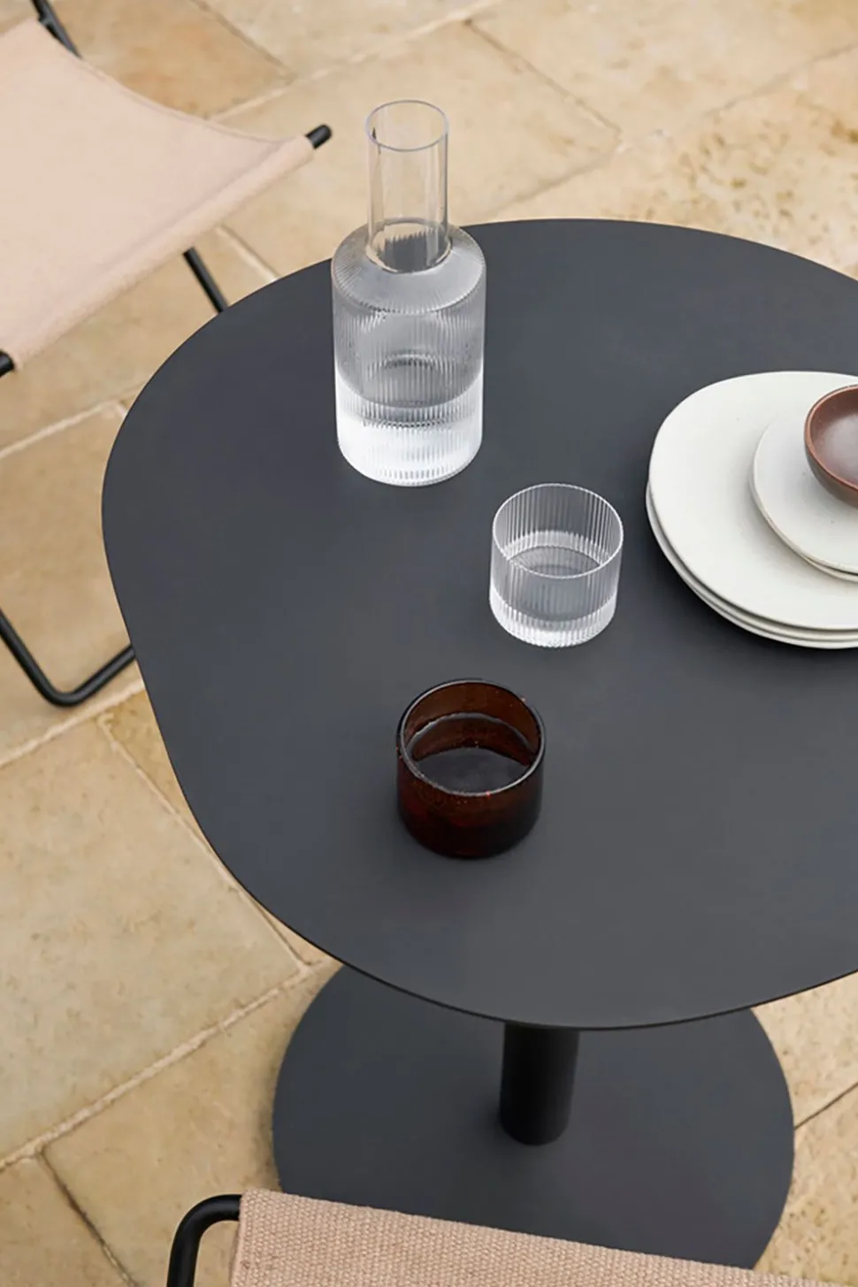 Der stilvolle und praktische Pond Café Table von ist eine schöne Ergänzung für jede Einrichtung und eignet sich perfekt, um eine gemütliche Atmosphäre in Ihrem Zuhause oder Büro zu schaffen. Die Tischplatte besteht aus schwarz lackiertem Metall und die Beine sind aus demselben Material, was ihm einen eleganten und modernen Look verleiht. Das runde Design verleiht ihm eine weiche und einladende Ausstrahlung und macht ihn zum perfekten Ort für eine Tasse Kaffee oder Tee.