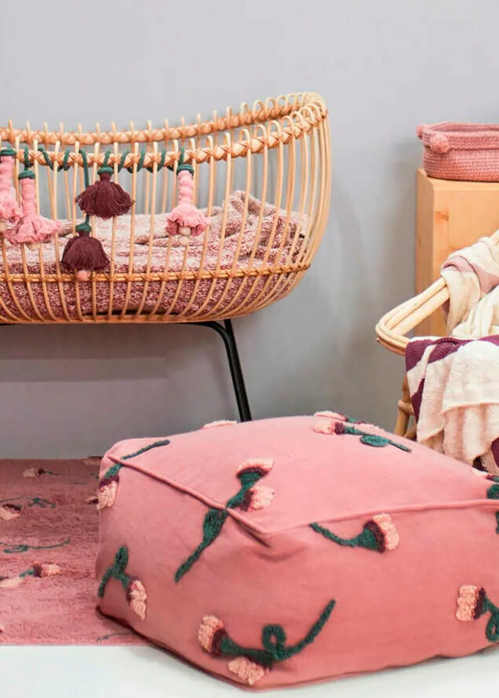 Der English Garden Pouf von ist ein schöner und eleganter Pouf. Der Hocker hat einen unifarbenen Hintergrund in Eschenrosa und ein florales Motiv, das Ihrem Raum einen Hauch von Eleganz verleihen wird. Der Hocker ist Teil der Serie English Gardens.