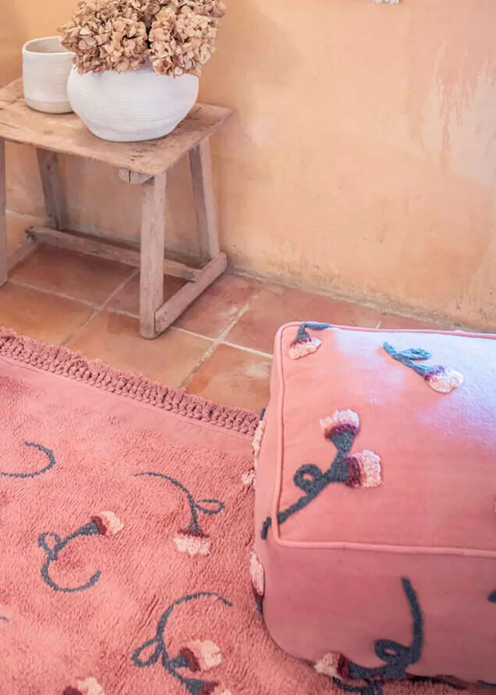 Der Hocker besteht aus natürlicher Baumwolle und ist pflegeleicht, da er in der normalen Waschmaschine gewaschen werden kann. Er eignet sich perfekt als zusätzliche Sitzgelegenheit, Fußstütze oder als dekoratives Detail in Ihrem Zuhause.