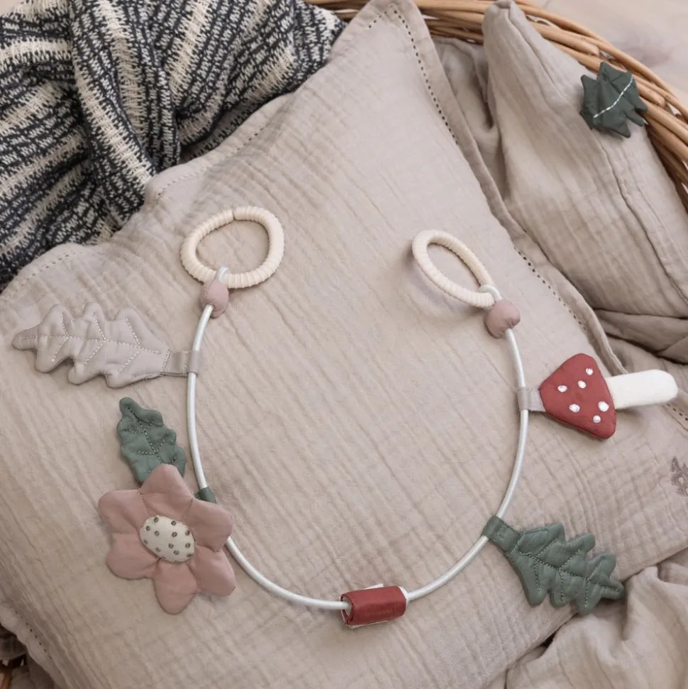 Niedliche Kinderwagenkette mit Baumwollfiguren in leuchtenden Farben, um das Baby während der Fahrt zu unterhalten und den Kinderwagen zu schmücken.