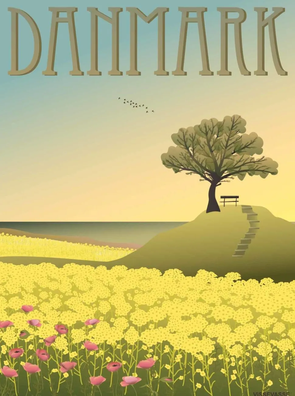 Typische dänische Landschaft an einem Frühsommertag. In der Mitte der Rapsfelder befindet sich ein Hügel, von dem aus man auf das Wasser blicken kann.