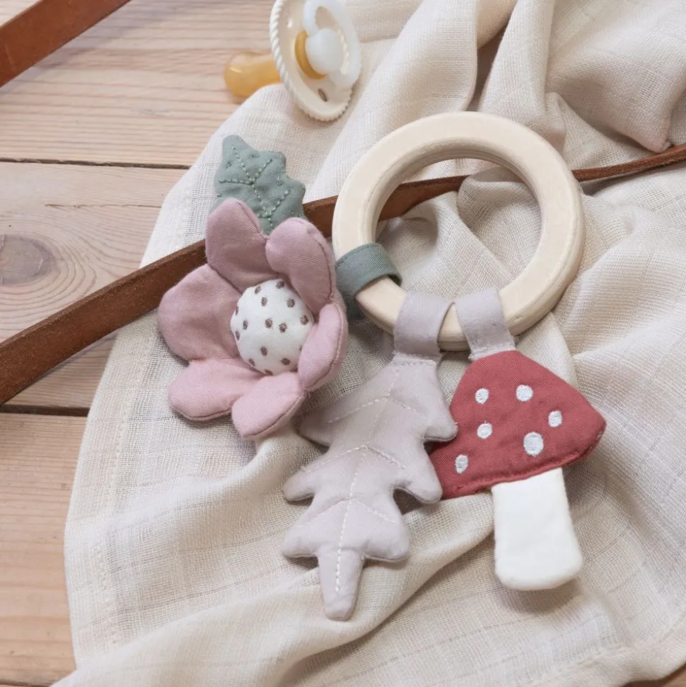 Rassel mit Holzring und Anhängern, um kleine Pfeilfinger zu unterhalten.