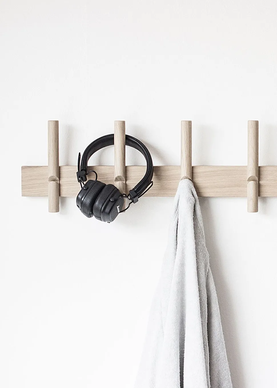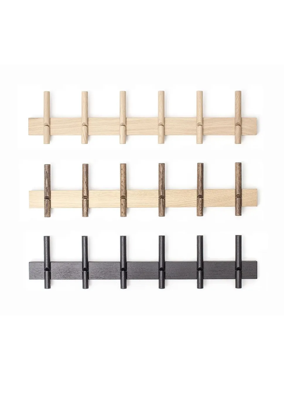 Die vertikalen Eichenholzbügel mit kleinen, gefrästen Aussparungen ermöglichen es, dass jede Garderobe mehrere Kleidungsstücke und Gegenstände aufnehmen kann, ohne dass sie überfüllt oder unordentlich werden.