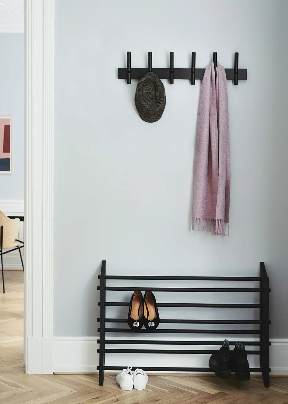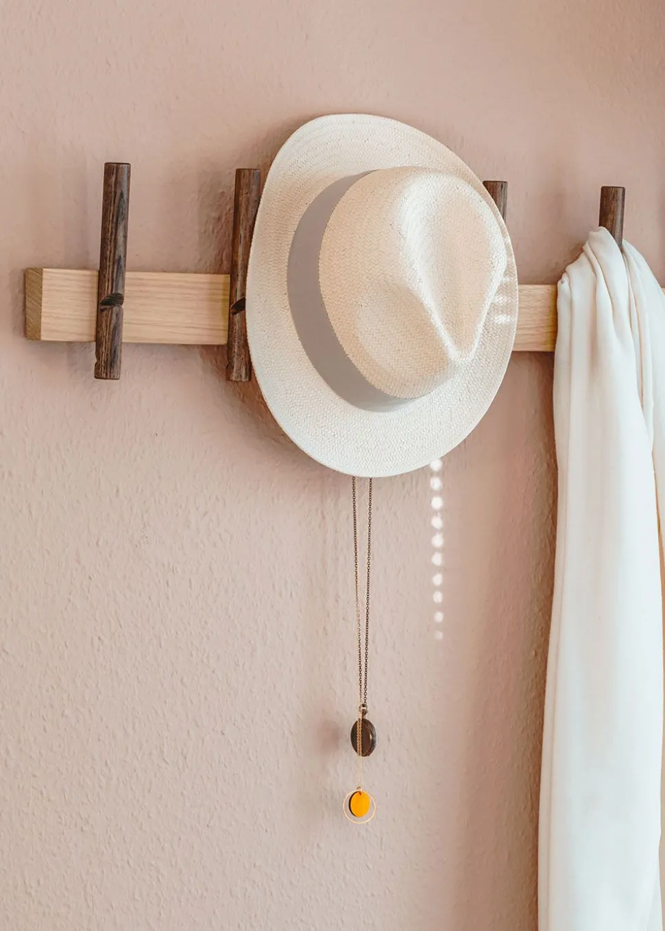 Die Garderobe ist nicht nur eine praktische Aufbewahrungslösung, sondern auch ein ästhetischer Genuss. Die natürliche Holzstruktur und das klare, nordische Design verleihen jedem Raum ein Gefühl von Ruhe und Schlichtheit. Mit seinem intelligenten Design ist er sowohl ein dekoratives Element als auch ein funktioneller Kleiderständer in einem.