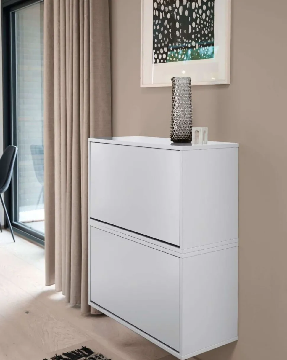 Ideal für den Flur, die Garderobe oder das Schlafzimmer, wo sie die Schuhe ordnet, ohne Platz auf dem Boden zu beanspruchen. Die Box kann einzeln oder in einem modularen System für einen einheitlichen und architektonischen Look kombiniert werden. Passt hervorragend zu natürlichen Materialien und hellen Farbtönen für einen klaren und harmonischen Look.