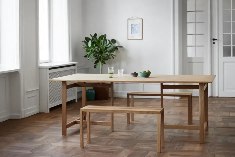 Der elegante rechteckige Esstisch von Moebe hat einen minimalistischen und modernen Look, der perfekt in jede stilvolle Einrichtung passt. Die Tischplatte ist aus hochwertigem Eichenholz gefertigt und wird von einem einfachen und robusten Metallgestell getragen, das für Stabilität und Langlebigkeit sorgt. Die rechteckige Form macht den Tisch ideal, um Freunde und Familie zu gemütlichen Abendessen und langen Gesprächen zu versammeln.