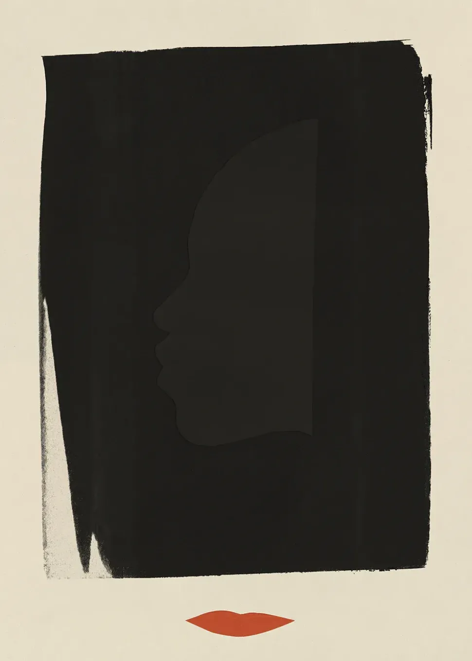 Wunderschönes Bild, entworfen von der schwedischen Illustratorin Cecilia Carlstedt. Dieses einzigartige Bild zeigt einen soliden schwarzen Hintergrund mit einer Person, die in einem helleren Schwarz aus dem Hintergrund auftaucht. Diese Person ist fast versteckt, was dem Bild eine gewisse Tiefe in der Komposition verleiht. Am unteren Rand des Bildes befinden sich rote Lippen. Dekorieren Sie Ihr Zuhause mit diesem einzigartigen Poster und schaffen Sie einen gemütlichen Raum, indem Sie dieses Poster und viele andere einzigartige Poster von verwenden.