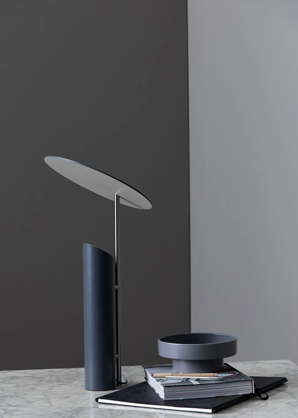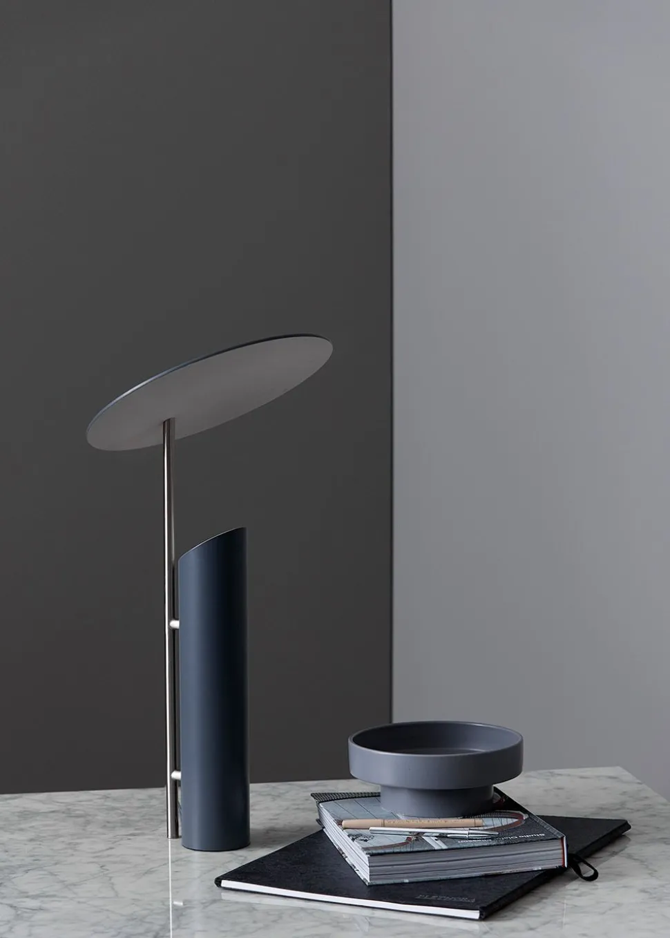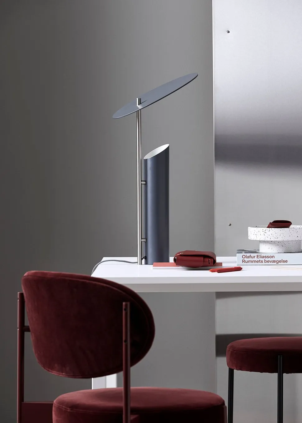 Reflect wurde von entworfen. Die Tischlampe hat eine Scheibe als Lampenschirm, die das Licht vom Sockel der Lampe reflektiert. Alle Teile sind aus Stahl gefertigt. Die Lampe ist in den Farben grau und rot erhältlich.