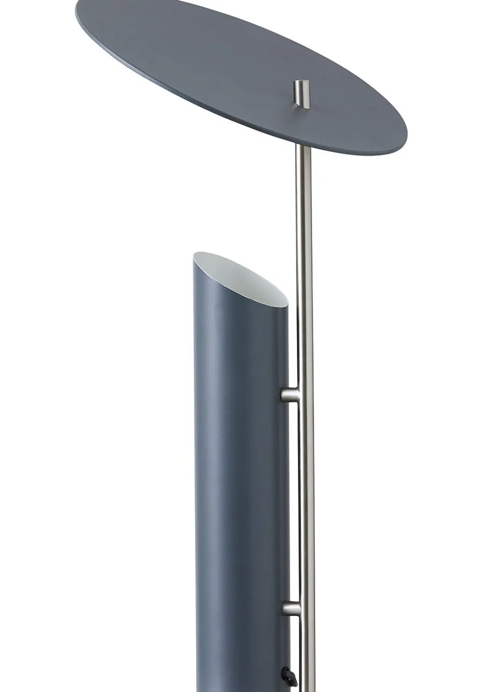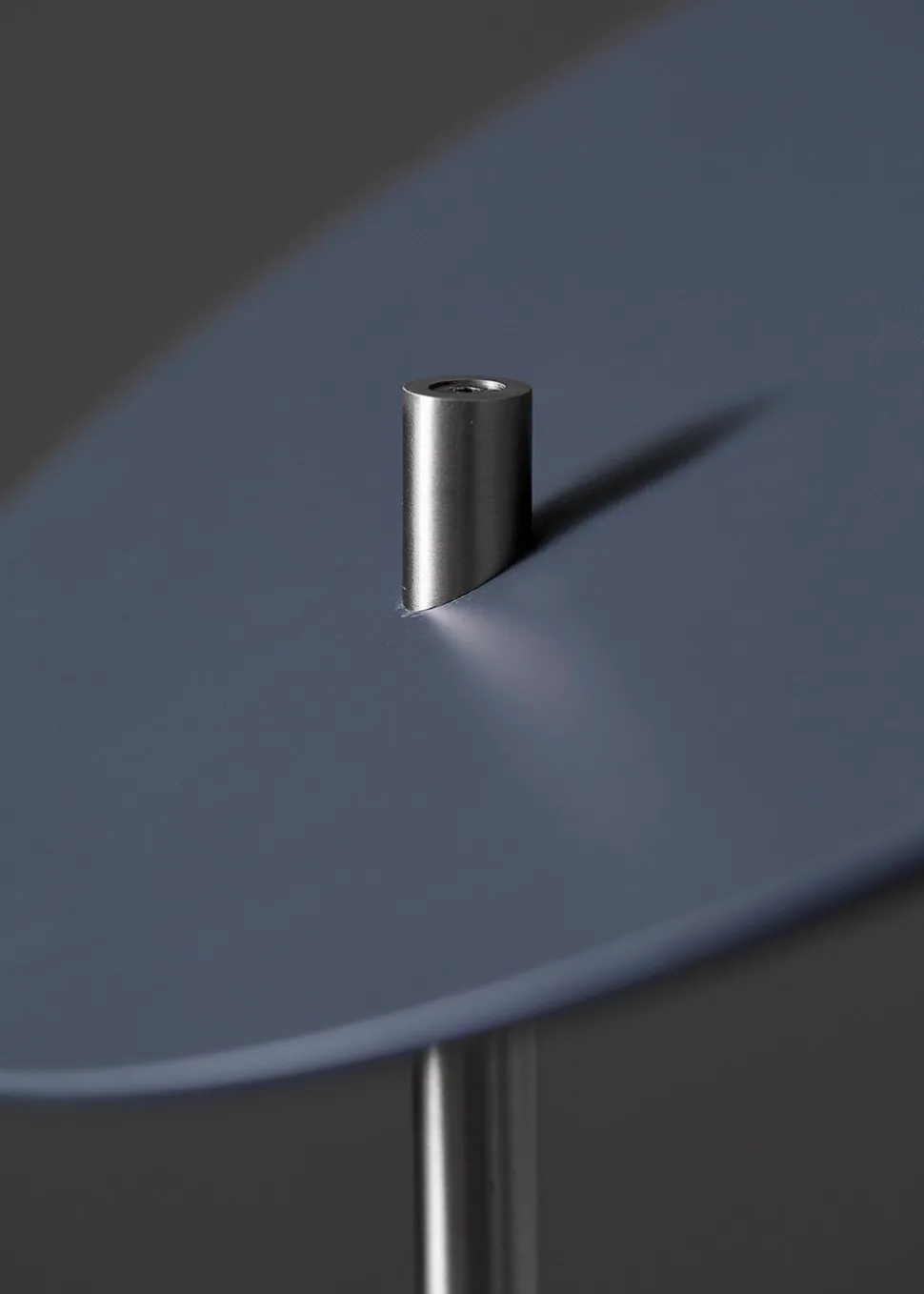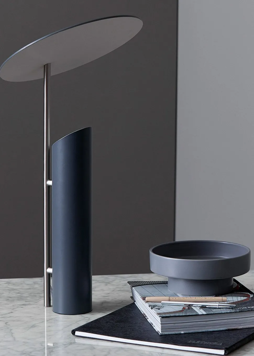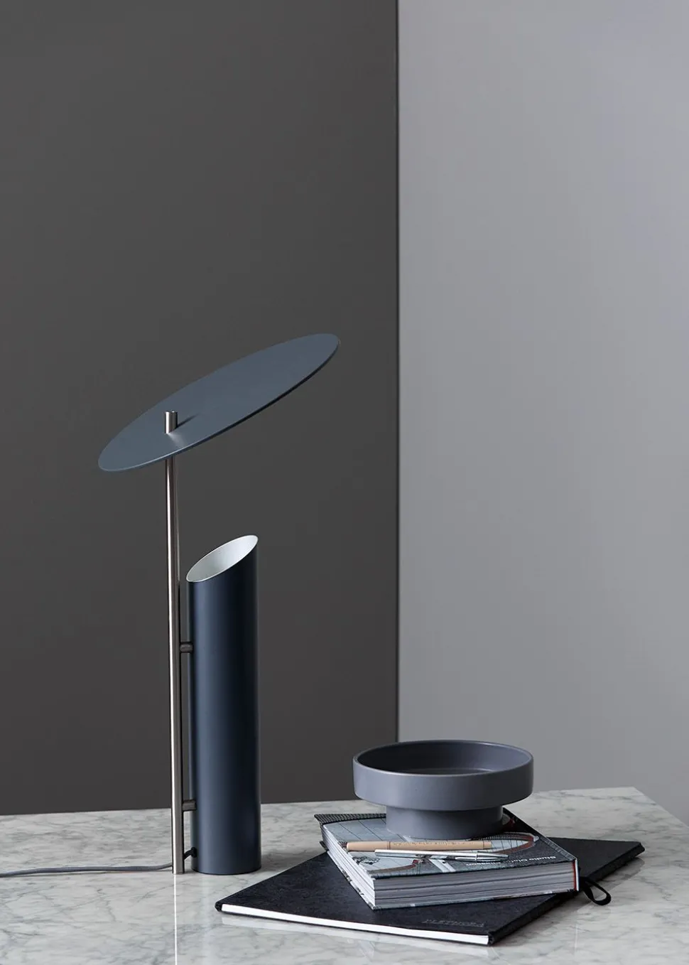 Reflect wurde von entworfen. Die Tischlampe hat eine Scheibe als Lampenschirm, die das Licht vom Sockel der Lampe reflektiert. Alle Teile sind aus Stahl gefertigt. Die Lampe ist in den Farben grau und rot erhältlich.