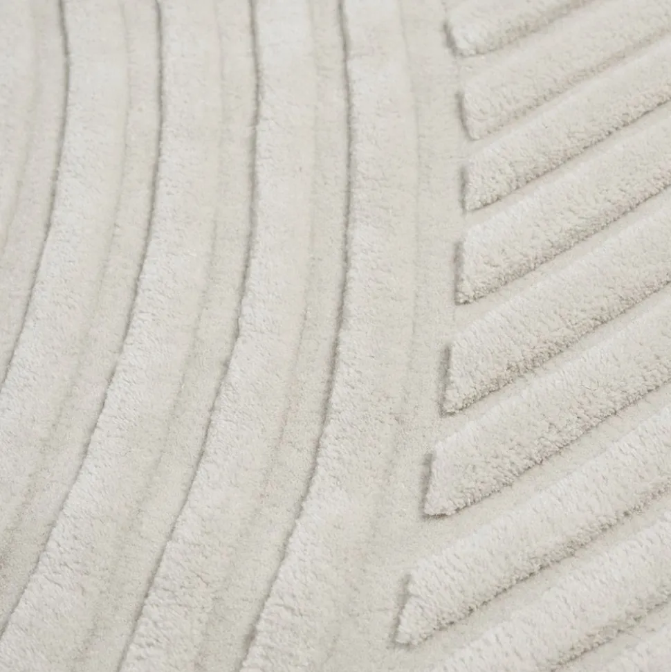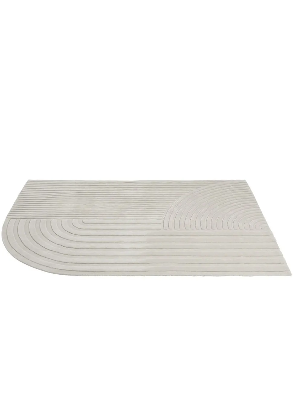 Relevo, ein Entwurf des italienischen Designstudios Studiopepe, stellt klassische Formen und unseren Sehsinn mit einem grafisch komponierten Teppich in Frage. Eine abgerundete Kante des Teppichs bildet einen Kontrast zu den anderen, rechtwinkligen Ecken des Teppichs, und dieser Kontrast findet sich auch im Muster des Teppichs wieder, das horizontale Linien mit geometrischen Kurven mischt.